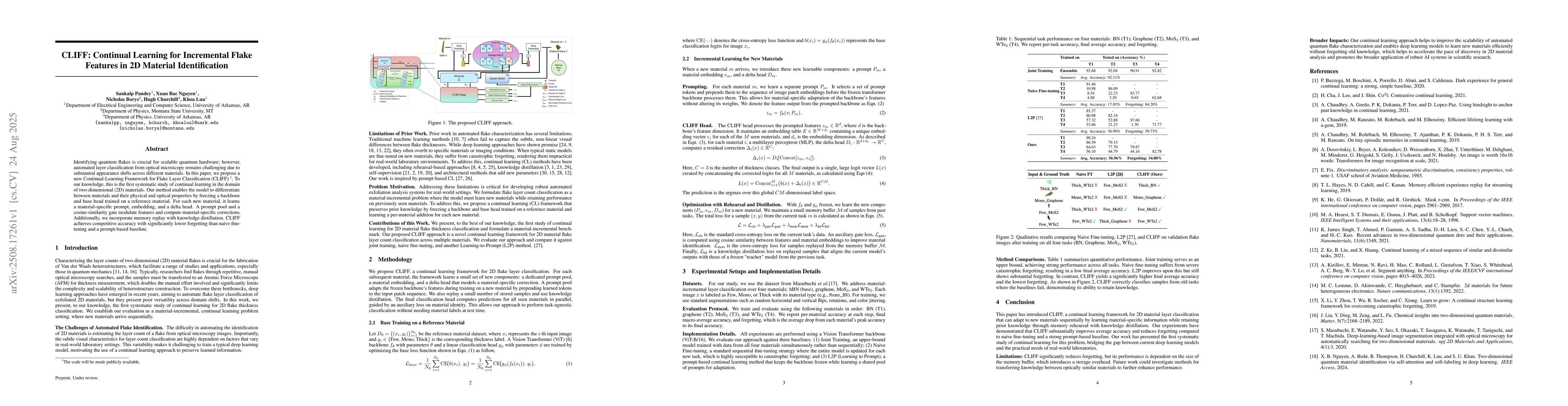 Identifying quantum flakes is crucial for scalable quantum hardware; however, automated layer classification from optical microscopy remains challenging due to substantial appearance shifts across different materials. In this paper, we propose a new Continual-Learning Framework for Flake Layer Classification (CLIFF). To our knowledge, this is the first systematic study of continual learning in the domain of two-dimensional (2D) materials. Our method enables the model to differentiate between materials and their physical and optical properties by freezing a backbone and base head trained on a reference material. For each new material, it learns a material-specific prompt, embedding, and a delta head. A prompt pool and a cosine-similarity gate modulate features and compute material-specific corrections. Additionally, we incorporate memory replay with knowledge distillation. CLIFF achieves competitive accuracy with significantly lower forgetting than naive fine-tuning and a prompt-based baseline.