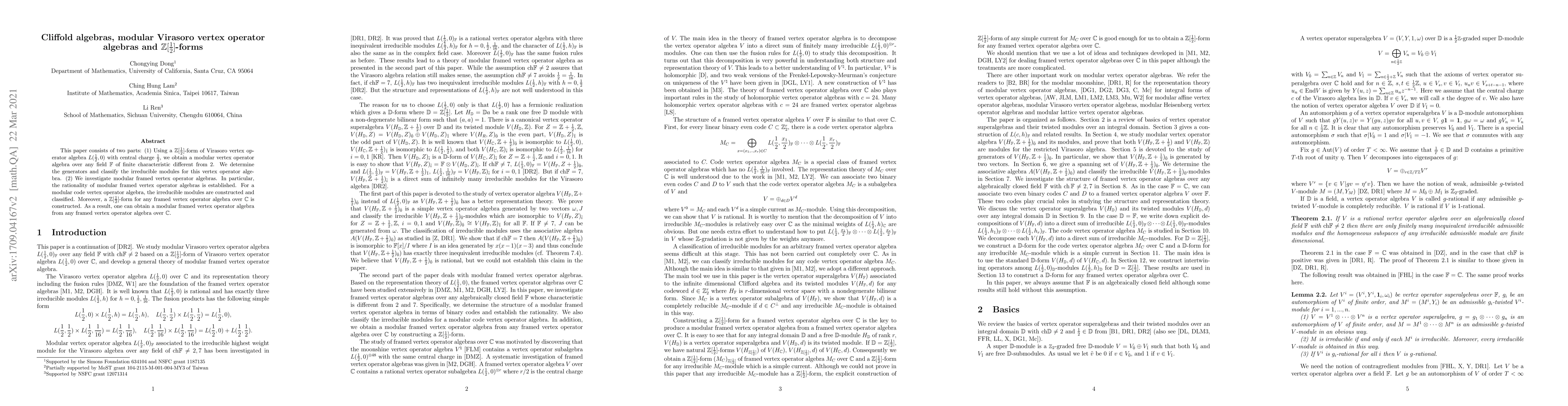 This paper consists of two parts: (1) Using a Z[1/2]-form of Virasoro vertex operator algebra L(1/2,0) with central charge 1/2, we obtain a modular vertex operator algebra over any field F of finite characteristic different from 2. We determine the generators and classify the irreducible modules for this vertex operator algebra. (2) We investigate modular framed vertex operator algebras. In particular, the rationality of modular framed vertex operator algebras is established. For a modular code vertex operator algebra, the irreducible modules are constructed and classified. Moreover, a Z[1/2]-form for any framed vertex operator algebra over complex field C is constructed. As a result, one can obtain a modular framed vertex operator algebra from any framed vertex operator algebra over C.