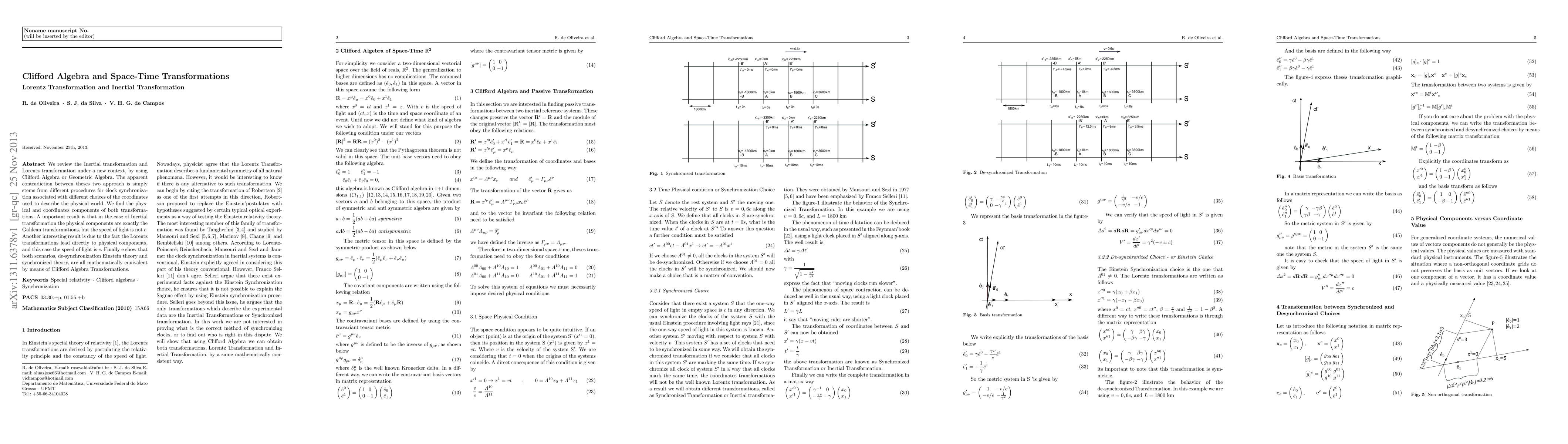 We review the Inertial transformation and Lorentz transformation under a new context, by using Clifford Algebra or Geometric Algebra. The apparent contradiction between theses two approach is simply stems from different procedures for clock synchronization associated with different choices of the coordinates used to describe the physical world. We find the physical and coordinates components of both transformations. A important result is that in the case of Inertial transformation the physical components are exactly the Galilean transformations, but the speed of light is not c. Another interesting result is due to the fact the Lorentz transformations lead directly to physical components, and this case the speed of light is c. Finally e show that both scenarios, de-synchronization Einstein theory and synchronized theory, are all mathematically equivalent by means of Clifford Algebra Transformations.