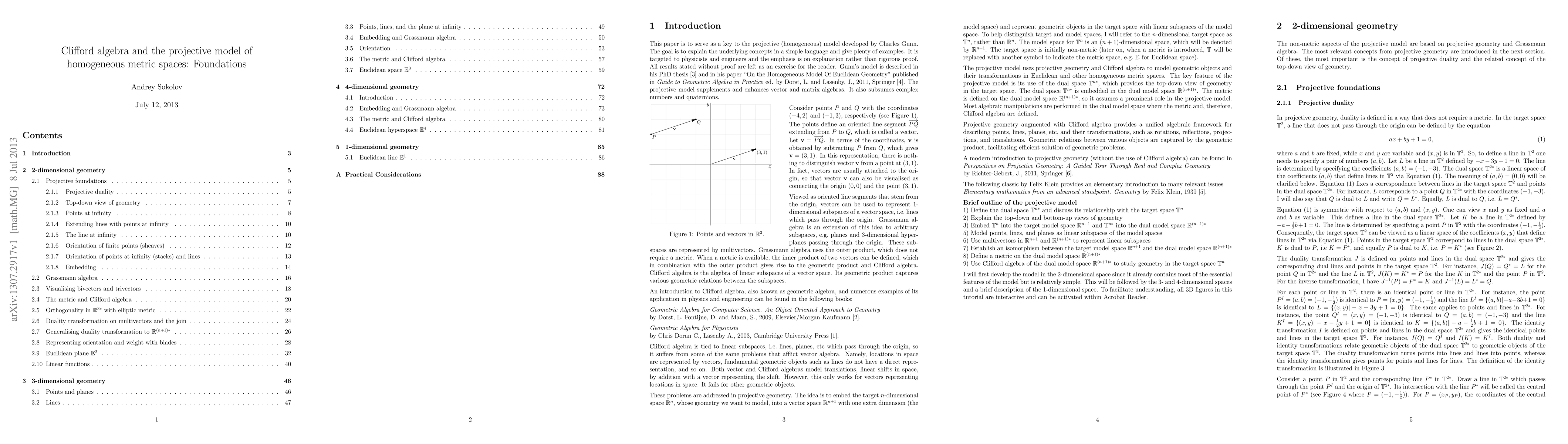 This paper introduces the projective model of homogeneous metric spaces using Clifford algebra and projective geometry, aiming to provide a clear explanation for physicists and engineers. It offers a unified algebraic framework that enhances traditional vector and matrix algebras, encompassing complex numbers and quaternions.