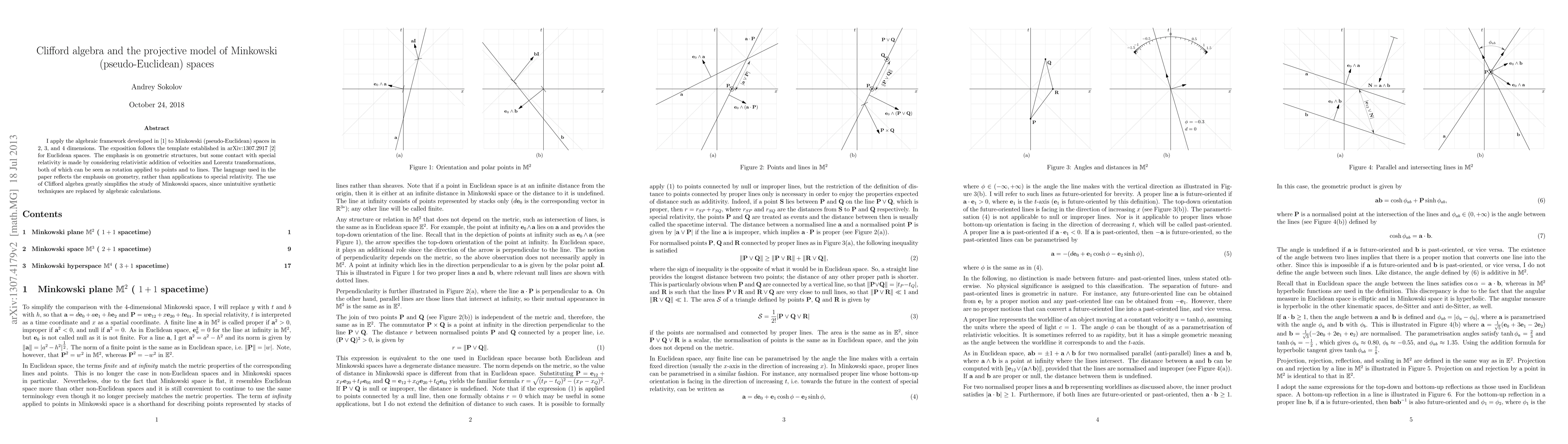 This paper applies Clifford algebra to study Minkowski (pseudo-Euclidean) spaces in dimensions 2, 3, and 4, simplifying geometric analysis through algebraic methods. It emphasizes geometric structures and briefly touches on special relativity via relativistic velocity addition and Lorentz transformations.