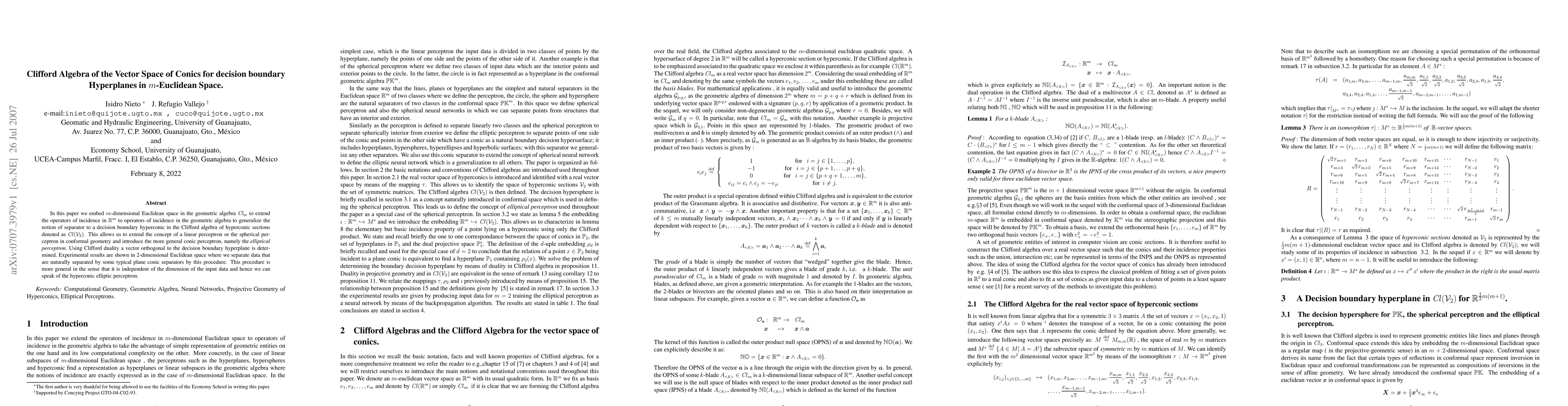 In this paper we embed $m$-dimensional Euclidean space in the geometric algebra $Cl_m $ to extend the operators of incidence in ${R^m}$ to operators of incidence in the geometric algebra to generalize the notion of separator to a decision boundary hyperconic in the Clifford algebra of hyperconic sections denoted as ${Cl}({Co}_{2})$. This allows us to extend the concept of a linear perceptron or the spherical perceptron in conformal geometry and introduce the more general conic perceptron, namely the {elliptical perceptron}. Using Clifford duality a vector orthogonal to the decision boundary hyperplane is determined. Experimental results are shown in 2-dimensional Euclidean space where we separate data that are naturally separated by some typical plane conic separators by this procedure. This procedure is more general in the sense that it is independent of the dimension of the input data and hence we can speak of the hyperconic elliptic perceptron.