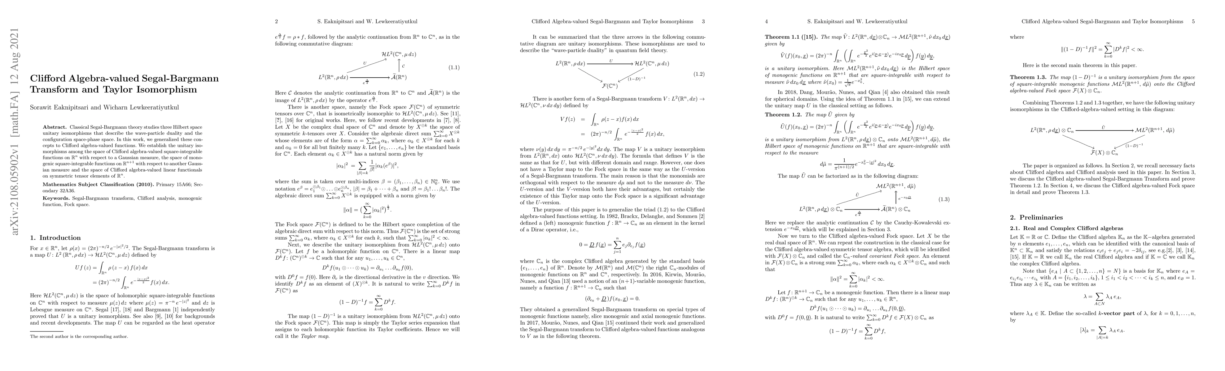This paper generalizes classical Segal-Bargmann theory to Clifford algebra-valued functions, establishing unitary isomorphisms among spaces of Clifford algebra-valued functions and monogenic functions, and linear functionals on symmetric tensors in $\mathbb{R}^n$.