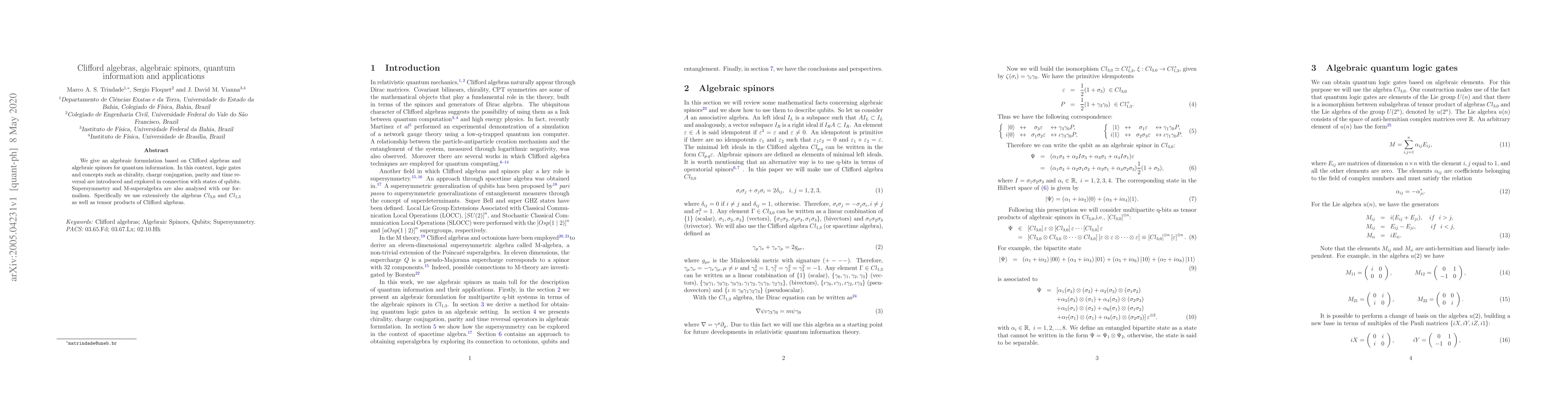This research proposes an algebraic framework based on Clifford algebras and algebraic spinors for quantum information, exploring logic gates and symmetries like chirality, charge conjugation, parity, and time reversal in the context of qubits, and analyzing supersymmetry and M-superalgebra through the use of $Cl_{3,0}$ and $Cl_{1,3}$ Clifford algebras and their tensor products.