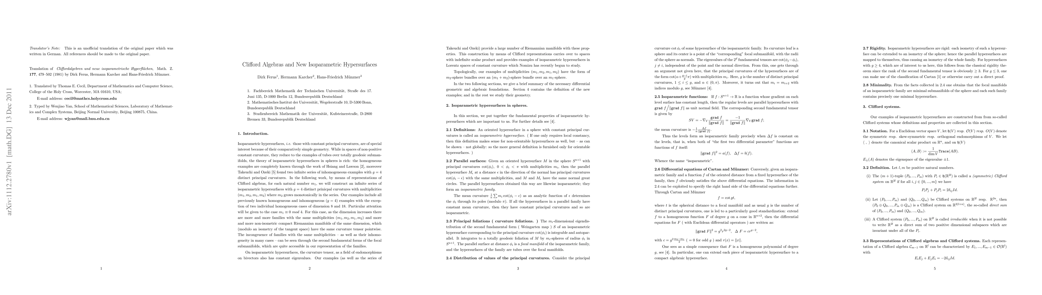 1. Translated by Thomas E. Cecil, Department of Mathematics and Computer Science, College of the Holy Cross, Worcester, MA 01610, USA; E-mail address: [email protected] 2. Typed by Wenjiao Yan, School of Mathematical Sciences, Laboratory of Mathematics and Complex Systems, Beijing Normal University, Beijing 100875, China. E-mail address: [email protected]