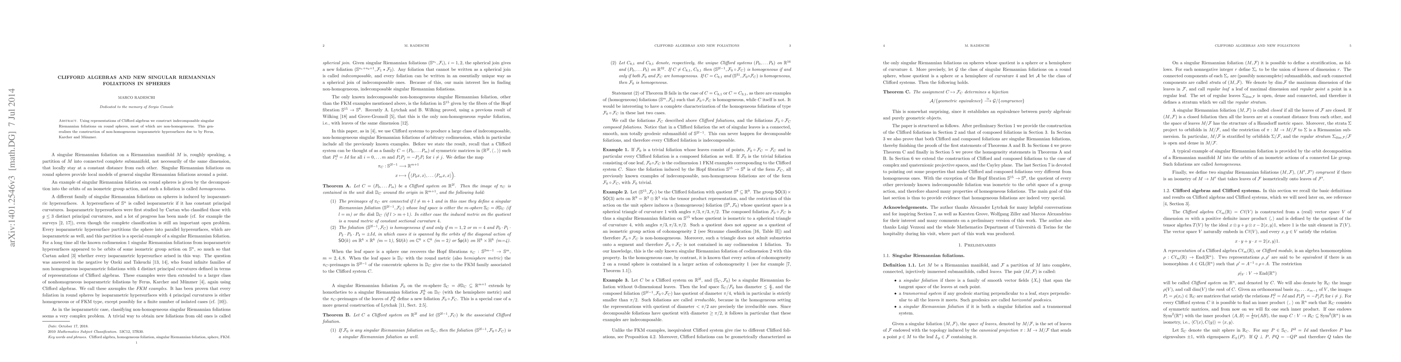 The paper constructs indecomposable singular Riemannian foliations on round spheres using Clifford algebra representations, generalizing the construction of non-homogeneous isoparametric hypersurfaces by Ferus, Karcher, and Münzner. These foliations are mostly non-homogeneous.