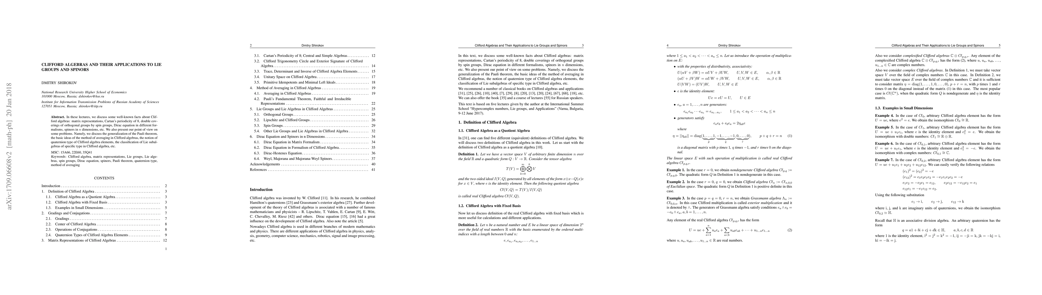 This paper explores Clifford algebras' matrix representations, their role in Lie groups and spinors, and their applications in the Dirac equation. It also delves into advanced topics such as the generalization of Pauli's theorem, the method of averaging, and the classification of Lie subalgebras in Clifford algebras.