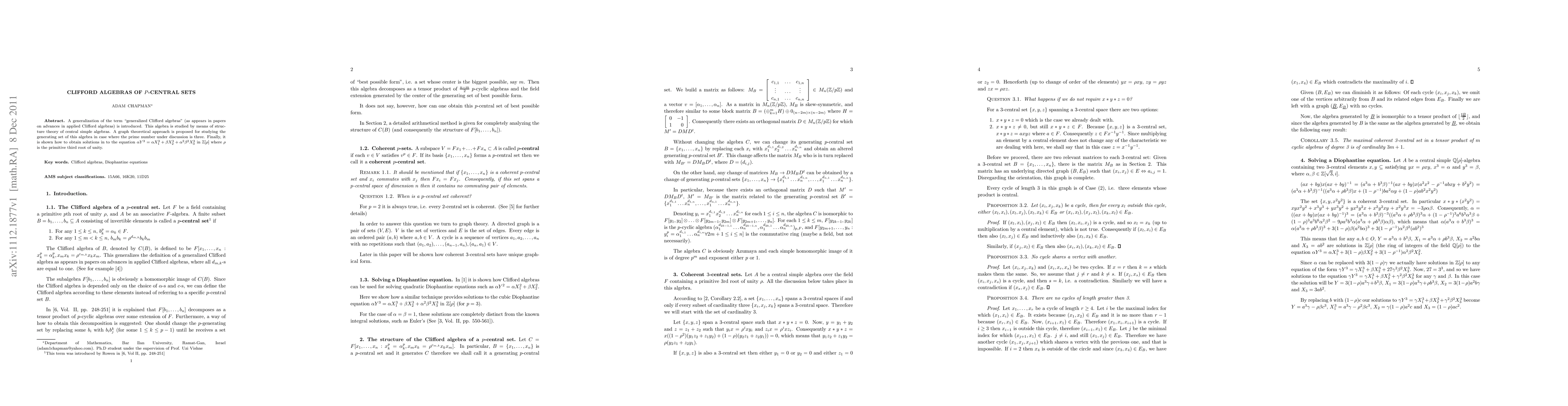 This paper introduces generalized Clifford algebras of $p$-central sets, particularly focusing on the prime number three. It employs structure theory and a graph theoretical approach to study the generating set, and solves the equation $\alpha Y^3=\alpha X_1^3+\beta X_2^3+\alpha^2 \beta^2 X_3^3$ in $\mathbb{Z}[\rho]$ where $\rho$ is the primitive third root of unity.