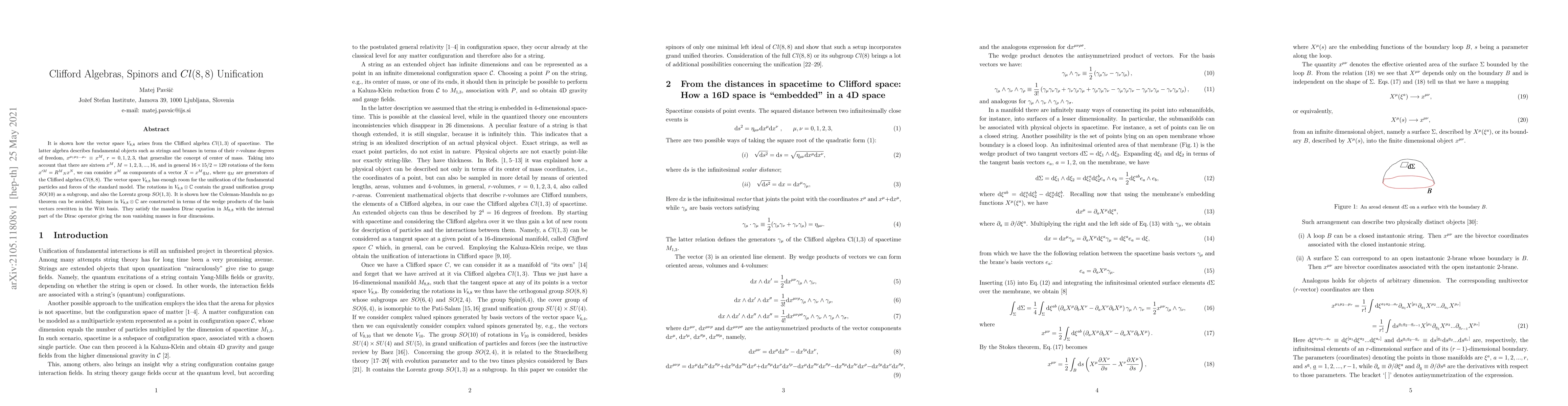 It is shown how the vector space $V_{8,8}$ arises from the Clifford algebra $Cl(1,3)$ of spacetime. The latter algebra describes fundamental objects such as strings and branes in terms of their $r$-volume degrees of freedom, $x^{\mu_1 \mu_2 ...\mu_r}$ $\equiv x^M$, $r=0,1,2,3$, that generalizethe concept of center of mass. Taking into account that there are sixteen $x^M$, $M=1,2,3,...,16$, and in general $16 \times 15/2 = 120$ rotations of the form $x'^M = {R^M}_N x^N$, we can consider $x^M$ as components of a vector $X=x^M q_M$, where $q_M$ are generators of the Clifford algebra $Cl(8,8)$. The vector space $V_{8,8}$ has enough room for the unification of the fundamental particles and forces of the standard model. The rotations in $V_{8,8}\otimes \mathbb{C}$ contain the grand unification group $SO(10)$ as a subgroup, and also the Lorentz group $SO(1,3)$. It is shown how the Coleman-Mandula no go theorem can be avoided. Spinors in $V_{8,8}\otimes \mathbb{C}$ are constructed in terms of the wedge products of the basis vectors rewritten in the Witt basis. They satisfy the massless Dirac equation in $M_{8,8}$ with the internal part of the Dirac operator giving the non vanishing masses in four dimensions.
