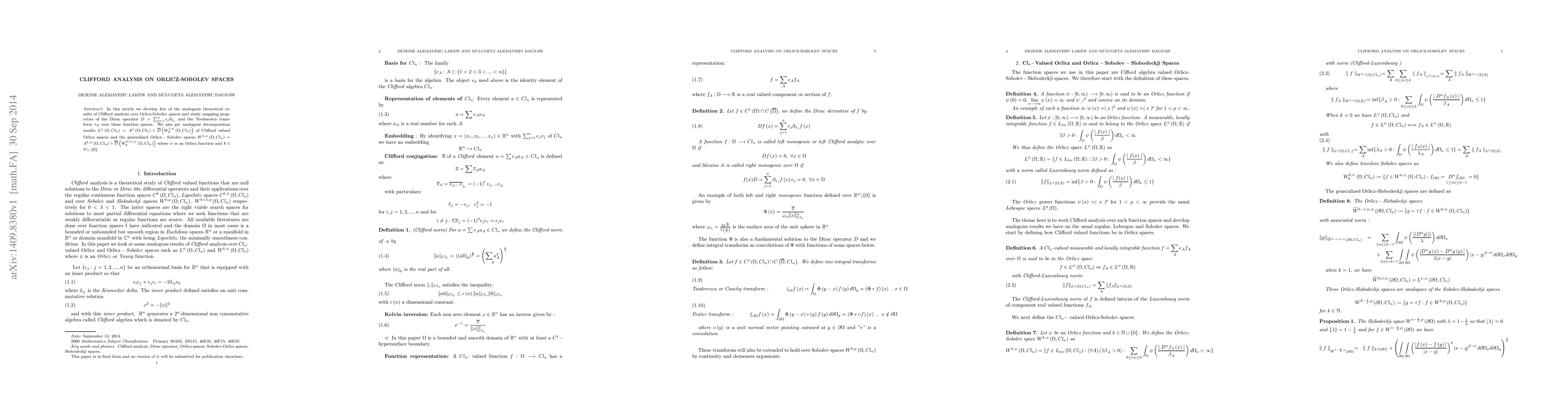This paper develops theoretical results for Clifford analysis on Orlicz-Sobolev spaces, focusing on the mapping properties of the Dirac operator and Teodorescu transform, and provides decomposition results for Clifford valued Orlicz spaces and generalized Orlicz-Sobolev spaces.