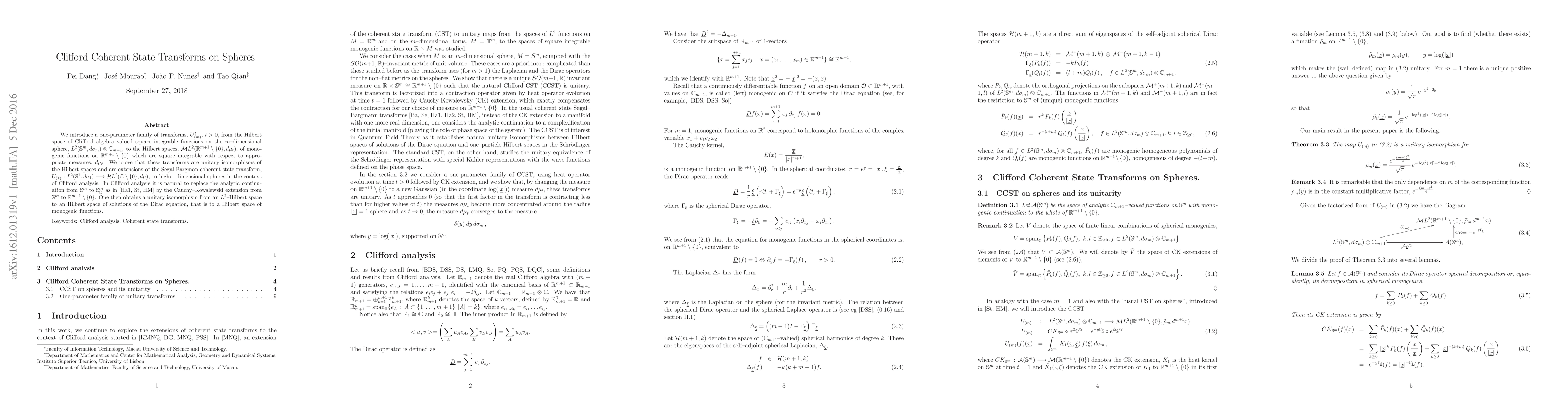 We introduce a one-parameter family of transforms, $U^t_{(m)}$, $t>0$, from the Hilbert space of Clifford algebra valued square integrable functions on the $m$--dimensional sphere, $L^2(S^{m},d\sigma_{m})\otimes \mathbb{C}_{m+1}$, to the Hilbert spaces, ${\mathcal M}L^2(\mathbb{R}^{m+1} \setminus \{0\},d\mu_t)$, of monogenic functions on $\mathbb{R}^{m+1}\setminus \{0\}$ which are square integrable with respect to appropriate measures, $d\mu_t$. We prove that these transforms are unitary isomorphisms of the Hilbert spaces and are extensions of the Segal-Bargman coherent state transform, $U_{(1)} : L^2(S^{1},d\sigma_{1}) \longrightarrow {\mathcal H}L^2({\mathbb{C} \setminus \{0\}},d\mu)$, to higher dimensional spheres in the context of Clifford analysis. In Clifford analysis it is natural to replace the analytic continuation from $S^m$ to $S^m_{\mathbb{C}}$ as in \cite{Ha1, St, HM} by the Cauchy--Kowalewski extension from $S^m$ to $\mathbb{R}^{m+1}\setminus \{0\}$. One then obtains a unitary isomorphism from an $L^2$--Hilbert space to an Hilbert space of solutions of the Dirac equation, that is to a Hilbert space of monogenic functions.