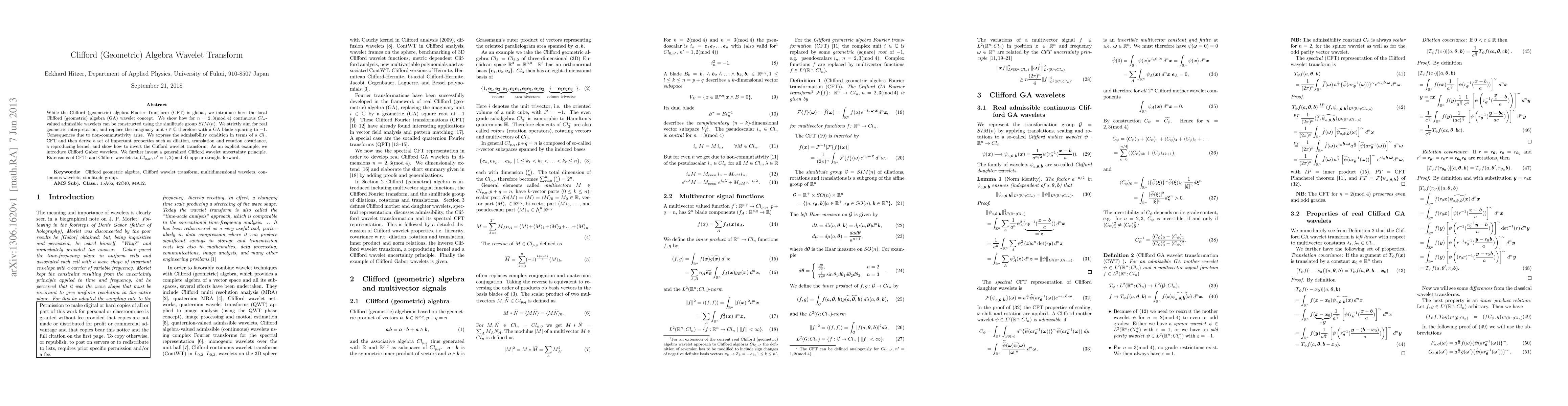 This paper introduces the local Clifford (geometric) algebra wavelet transform, constructing $Cl_n$-valued admissible wavelets for $n=2,3 (\mod 4)$ using the similitude group. It explores properties such as dilation, translation, and rotation covariance, and presents a generalized Clifford wavelet uncertainty principle.
