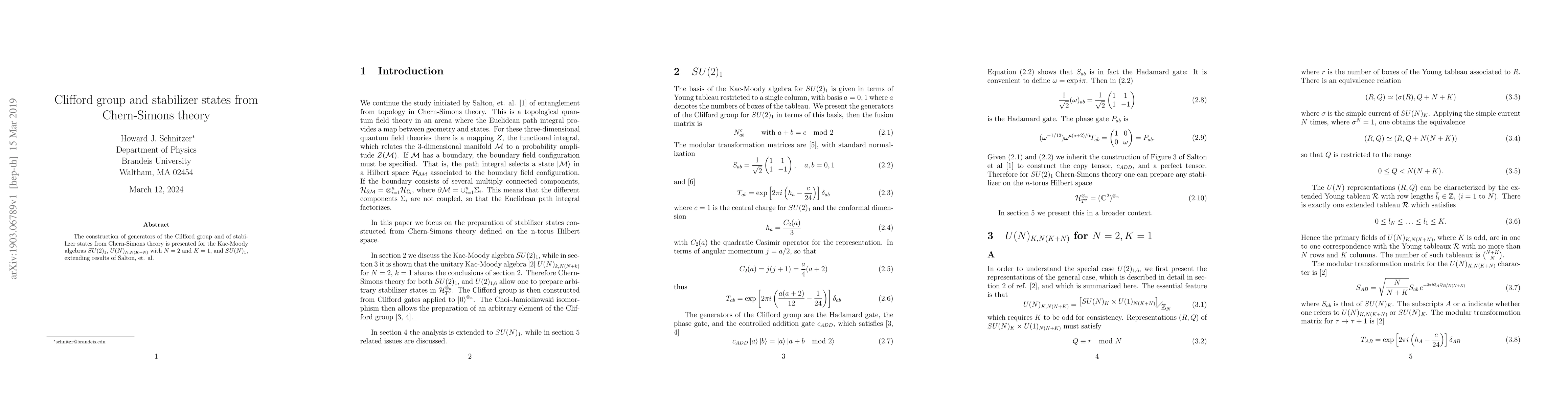 This paper constructs generators of the Clifford group and stabilizer states from Chern-Simons theory for Kac-Moody algebras including SU(2)1, U(N)N,N(K+N) with N=2 and K=1, and SU(N)1, extending previous results by Salton et al.