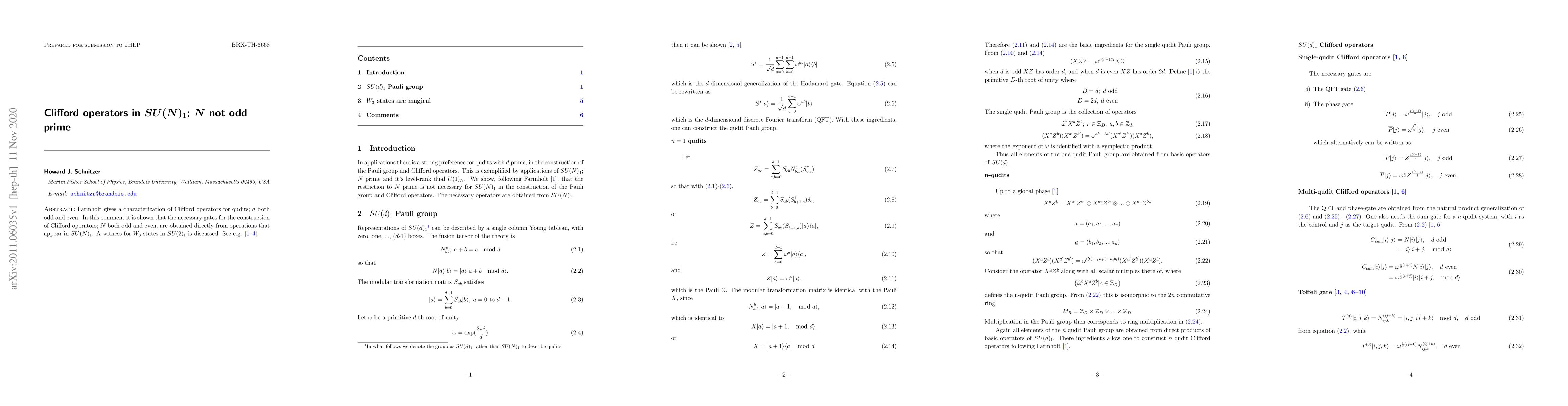 Farinholt gives a characterization of Clifford operators for qudits; d both odd and even. In this comment it is shown that the necessary gates for the construction of Clifford operators; N both odd and even, are obtained directly from operations that appear in SU(N)1. A witness for W3 states in SU(2)1 is discussed. See e.g. [1-4].