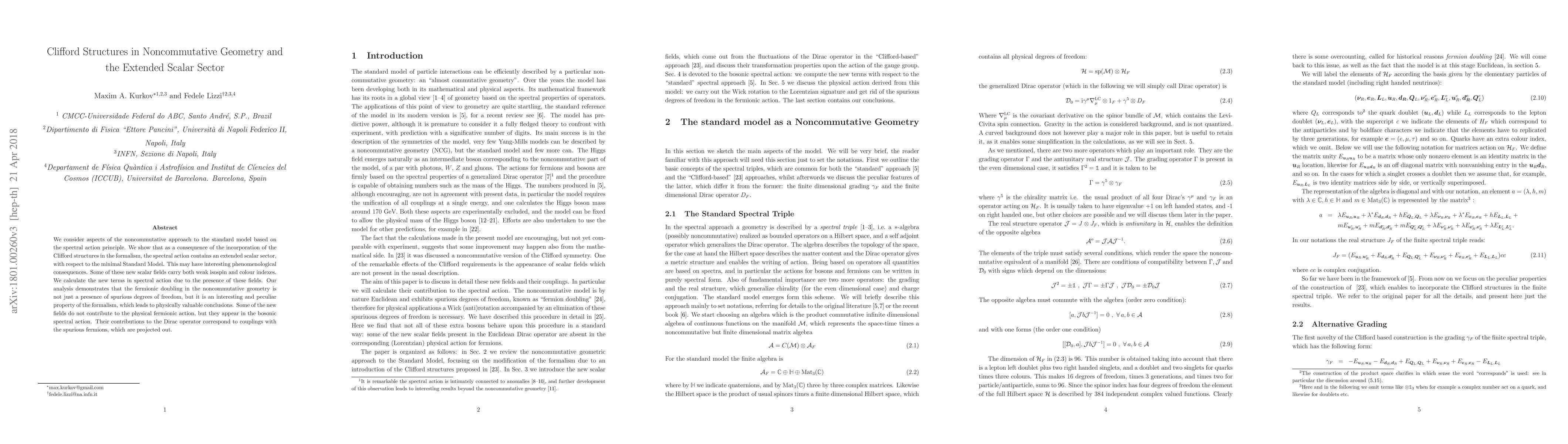 We consider aspects of the noncommutative approach to the standard model based on the spectral action principle. We show that as a consequence of the incorporation of the Clifford structures in the formalism, the spectral action contains an extended scalar sector, with respect to the minimal Standard Model. This may have interesting phenomenological consequences. Some of these new scalar fields carry both weak isospin and colour indexes. We calculate the new terms in spectral action due to the presence of these fields. Our analysis demonstrates that the fermionic doubling in the noncommutative geometry is not just a presence of spurious degrees of freedom, but it is an interesting and peculiar property of the formalism, which leads to physically valuable conclusions. Some of the new fields do not contribute to the physical fermionic action, but they appear in the bosonic spectral action. Their contributions to the Dirac operator correspond to couplings with the spurious fermions, which are projected out.