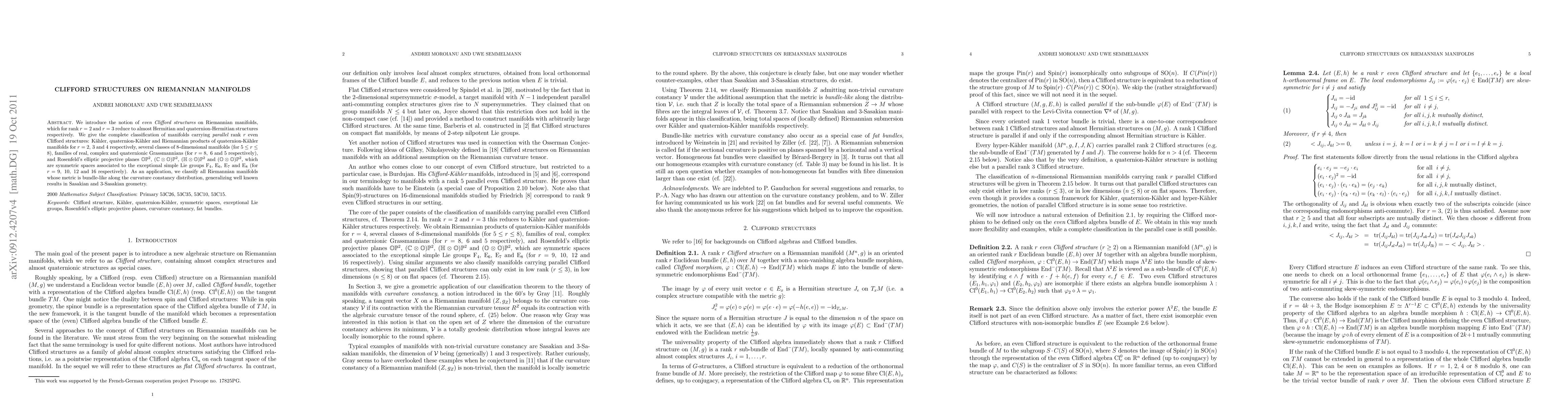 This paper classifies Riemannian manifolds with parallel even Clifford structures, generalizing previous Hermitian and quaternion-Hermitian geometries, and applies the results to classify Riemannian manifolds with bundle-like metrics along curvature constancy distributions, extending Sasakian and 3-Sasakian geometries.