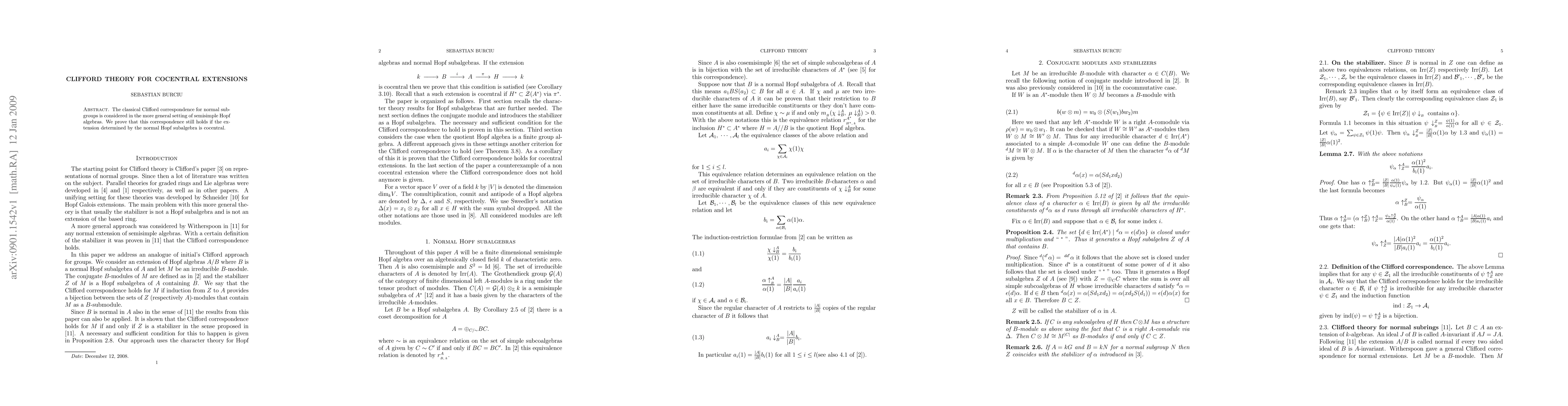 The classical Clifford correspondence for normal subgroups is considered in the more general setting of semisimple Hopf algebras. We prove that this correspondence still holds if the extension determined by the normal Hopf subalgebra is cocentral.