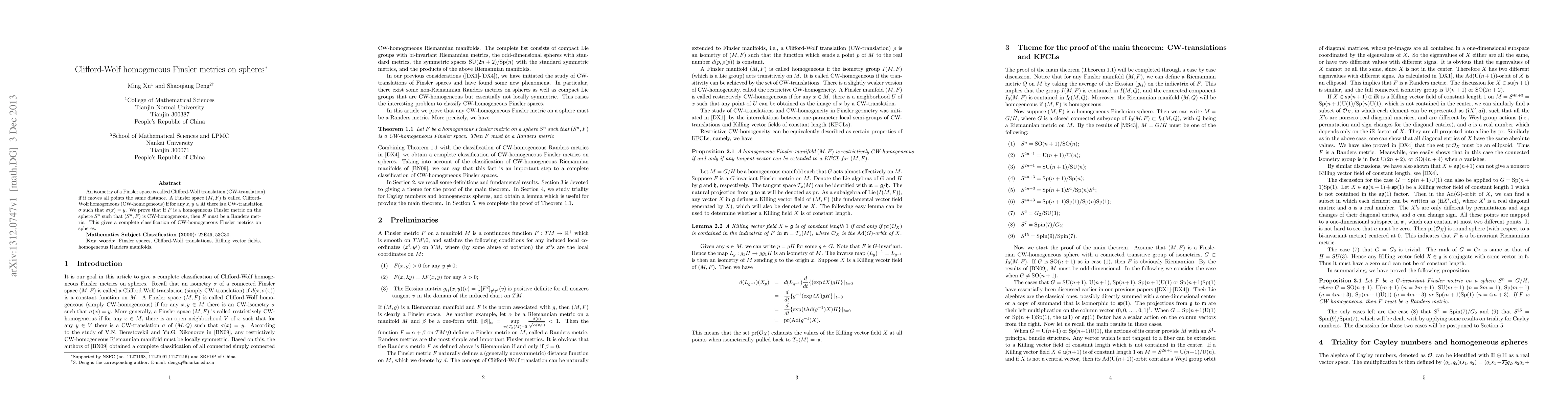 This paper proves that any homogeneous Finsler metric on a sphere that is Clifford-Wolf homogeneous must be a Randers metric, providing a complete classification of such metrics on spheres.