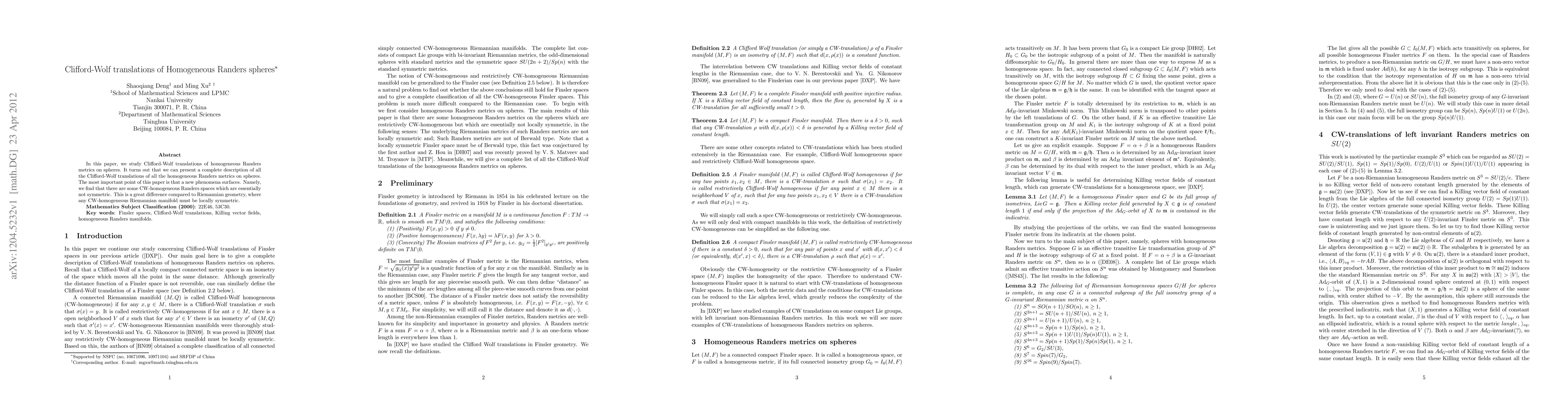 This paper investigates Clifford-Wolf translations of homogeneous Randers metrics on spheres, presenting a complete characterization of such translations. Notably, it reveals the existence of CW-homogeneous Randers spaces that are not symmetric, contrasting with the symmetry required in Riemannian geometry.