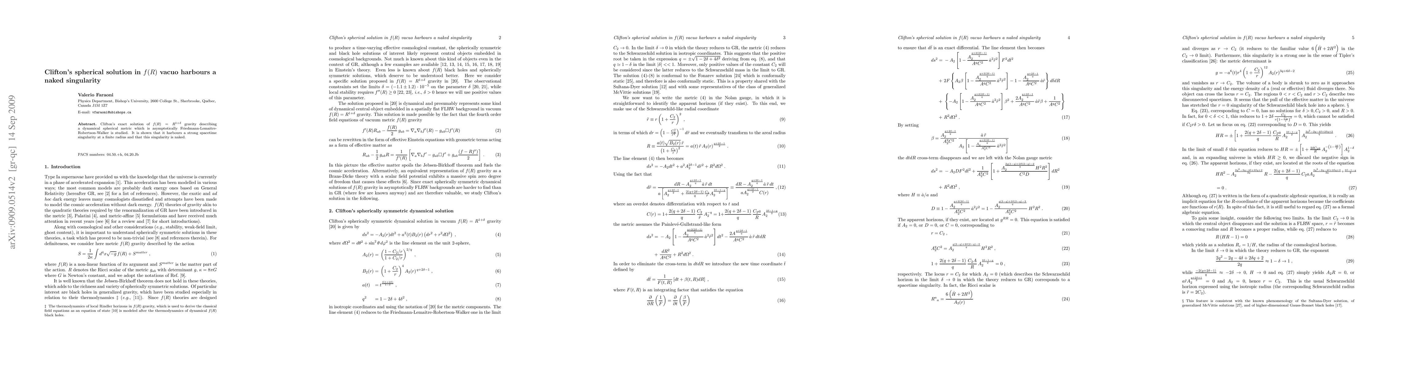 Clifton's exact solution of f(R)=R^(1+\delta) gravity describing a dynamical spherical metric which is asymptotically Friedmann-Lemaitre-Robertson-Walker is studied. It is shown that it harbours a strong spacetime singularity and that this singularity is naked at late times.