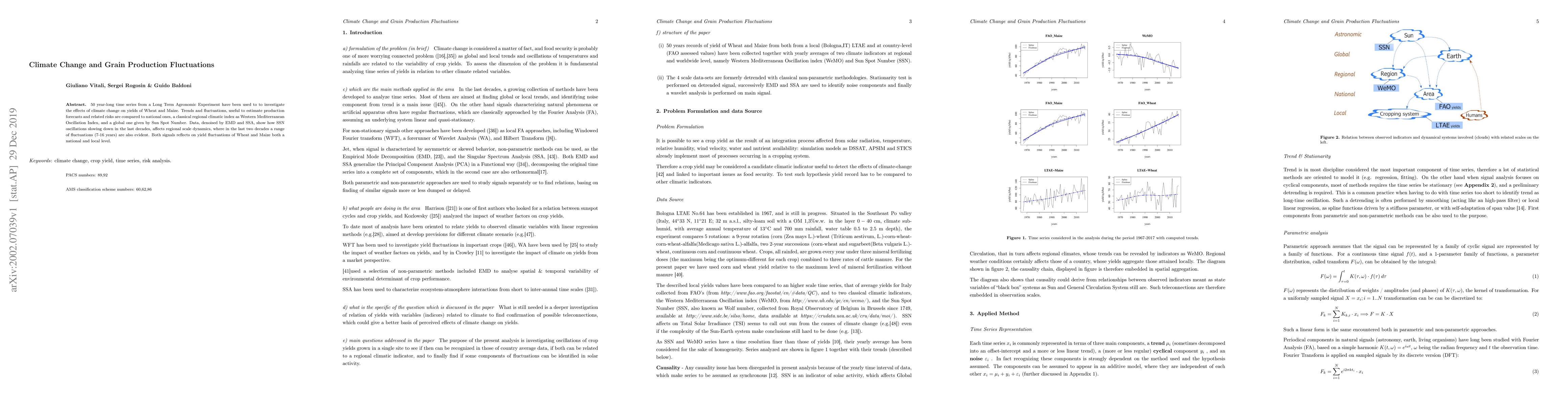 50 year-long time series from a Long Term Agronomic Experiment have been used to to investigate the effects of climate change on yields of Wheat and Maize. Trends and fluctuations, useful to estimate production forecasts and related risks are compared to national ones, a classical regional climatic index as Western Mediterranean Oscillation Index, and a global one given by Sun Spot Number. Data, denoised by EMD and SSA, show how SSN oscillations slowing down in the last decades, affects regional scale dynamics, where in the last two decades a range of fluctuations (7-16 years) are also evident. Both signals reflects on yield fluctuations of Wheat and Maize both a national and local level.