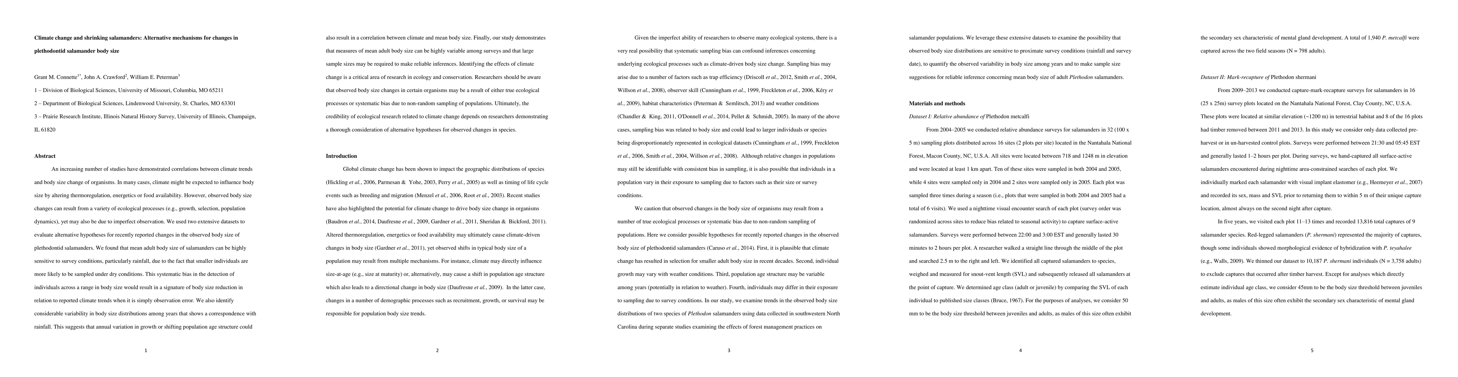 An increasing number of studies have demonstrated correlations between climate trends and body size change of organisms. In many cases, climate might be expected to influence body size by altering thermoregulation, energetics or food availability. However, observed body size changes can result from ecological processes (e.g., growth, selection, population dynamics), yet may also be due to imperfect observation. We used two extensive datasets to evaluate alternative hypotheses for recently reported changes in the observed body size of plethodontid salamanders. We found that mean adult body size of salamanders can be highly sensitive to survey conditions, particularly rainfall, such that smaller individuals are more likely to be sampled under dry conditions. This systematic bias in the detection of individuals across a range in body size would result in a signature of body size reduction in relation to reported climate trends when it is simply observation error. We also identify considerable variability in body size distributions among years that shows correspondence with rainfall. This suggests that annual variation in growth or shifting population age structure could also result in a correlation between climate and mean body size. Finally, our study demonstrates that measures of mean adult body size can be highly variable among surveys and that large sample sizes may be required to make reliable inferences. Identifying the effects of climate change is critical for future research in ecology and conservation. Researchers should be aware that observed body size changes in some organisms may be a result of true ecological processes or systematic bias due to non-random sampling of populations. Ultimately, the credibility of ecological research related to climate change depends on researchers demonstrating a thorough consideration of alternative hypotheses for observed changes in species.