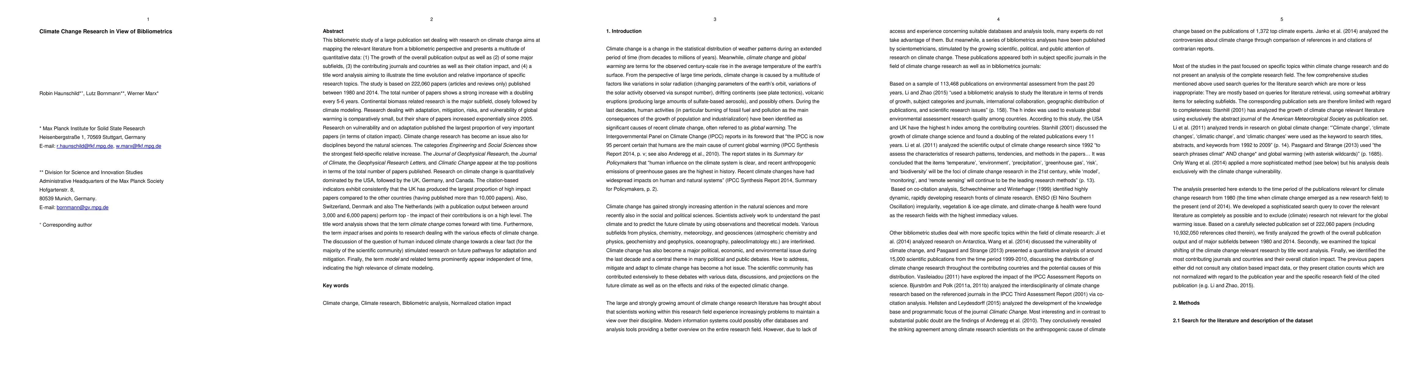 This bibliometric study analyzes 222,060 climate change papers published from 1980 to 2014, revealing a doubling of publication output every 5-6 years, with biomass and climate modeling as major subfields. The UK leads in high-impact papers, while the USA dominates in publication numbers.