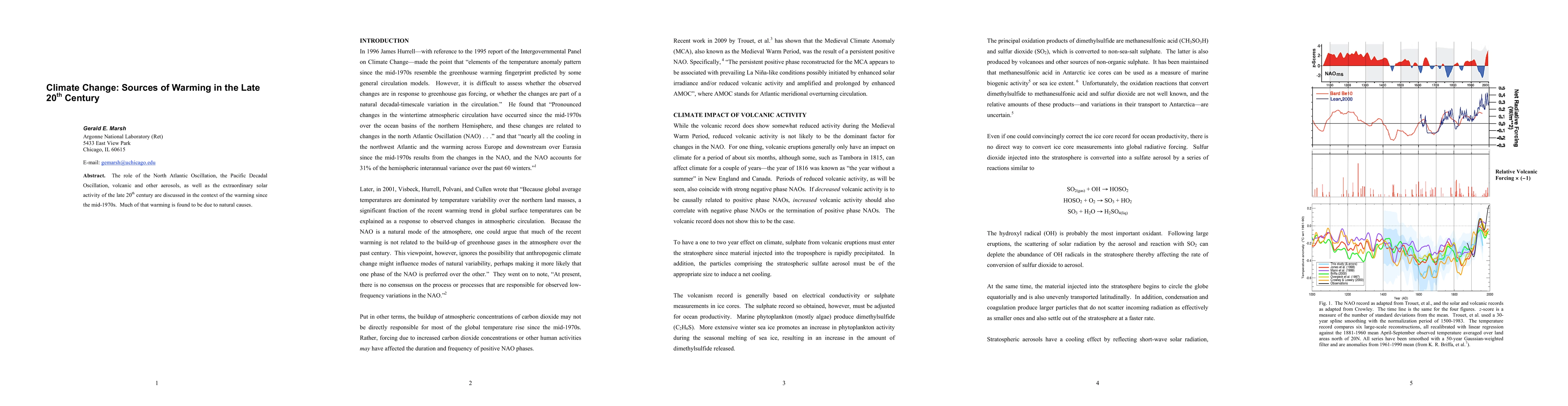 Summary: This paper investigates the sources of late 20th-century warming, attributing much of it to natural phenomena like the North Atlantic Oscillation and the Pacific Decadal Oscillation, alongside volcanic and other aerosols, rather than solely anthropogenic factors.