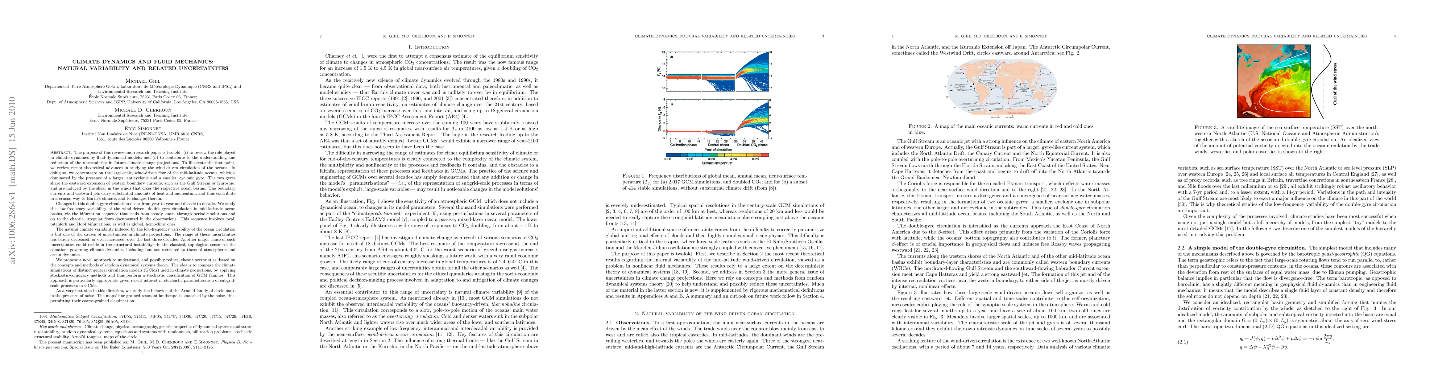 The purpose of this review-and-research paper is twofold: (i) to review the role played in climate dynamics by fluid-dynamical models; and (ii) to contribute to the understanding and reduction of the uncertainties in future climate-change projections. To illustrate the first point, we focus on the large-scale, wind-driven flow of the mid-latitude oceans which contribute in a crucial way to Earth's climate, and to changes therein. We study the low-frequency variability (LFV) of the wind-driven, double-gyre circulation in mid-latitude ocean basins, via the bifurcation sequence that leads from steady states through periodic solutions and on to the chaotic, irregular flows documented in the observations. This sequence involves local, pitchfork and Hopf bifurcations, as well as global, homoclinic ones. The natural climate variability induced by the LFV of the ocean circulation is but one of the causes of uncertainties in climate projections. Another major cause of such uncertainties could reside in the structural instability in the topological sense, of the equations governing climate dynamics, including but not restricted to those of atmospheric and ocean dynamics. We propose a novel approach to understand, and possibly reduce, these uncertainties, based on the concepts and methods of random dynamical systems theory. As a very first step, we study the effect of noise on the topological classes of the Arnol'd family of circle maps, a paradigmatic model of frequency locking as occurring in the nonlinear interactions between the El Nino-Southern Oscillations (ENSO) and the seasonal cycle. It is shown that the maps' fine-grained resonant landscape is smoothed by the noise, thus permitting their coarse-grained classification. This result is consistent with stabilizing effects of stochastic parametrization obtained in modeling of ENSO phenomenon via some general circulation models.