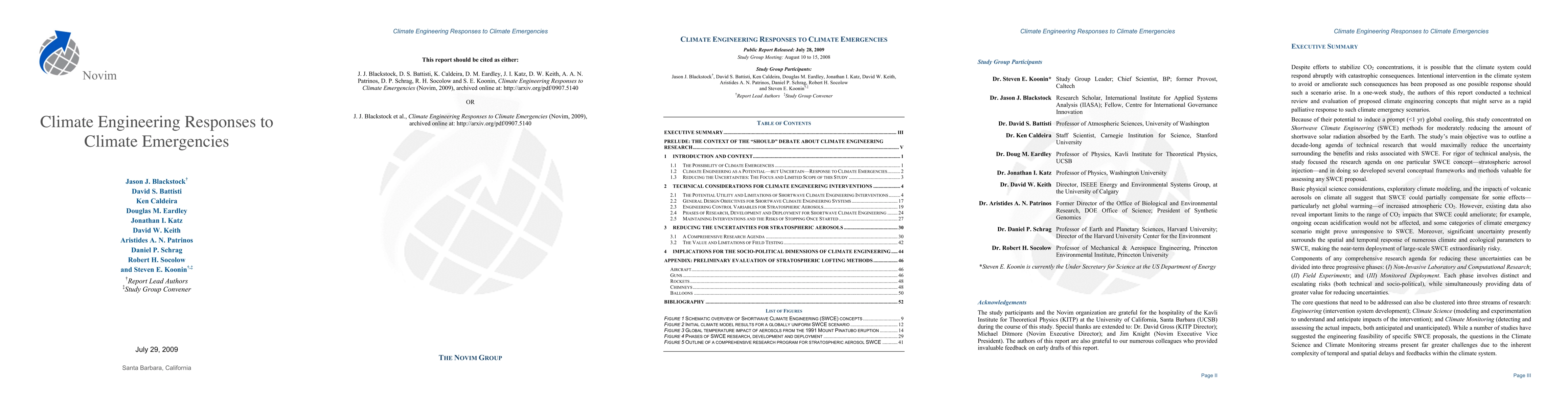 Despite efforts to stabilize CO_2 concentrations, it is possible that the climate system could respond abruptly with catastrophic consequences. Intentional intervention in the climate system to avoid or ameliorate such consequences has been proposed as one possible response, should such a scenario arise. In a one-week study, the authors of this report conducted a technical review and evaluation of proposed climate engineering concepts that might serve as a rapid palliative response to such climate emergency scenarios. Because of their potential to induce a prompt (less than one year) global cooling, this study concentrated on Shortwave Climate Engineering (SWCE) methods for moderately reducing the amount of shortwave solar radiation reaching the Earth. The study's main objective was to outline a decade-long agenda of technical research that would maximally reduce the uncertainty surrounding the benefits and risks associated with SWCE. For rigor of technical analysis, the study focused the research agenda on one particular SWCE concept--stratospheric aerosol injection--and in doing so developed several conceptual frameworks and methods valuable for assessing any SWCE proposal.