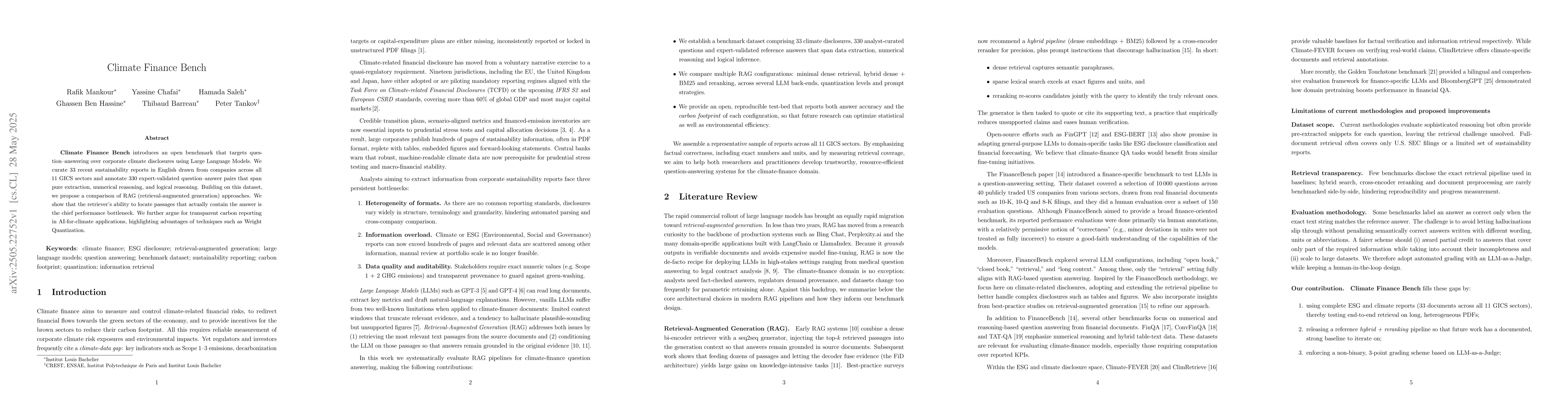 The paper presents Climate Finance Bench, an open benchmark for evaluating AI models on corporate climate disclosure question-answering tasks, along with a comparative analysis of RAG approaches.