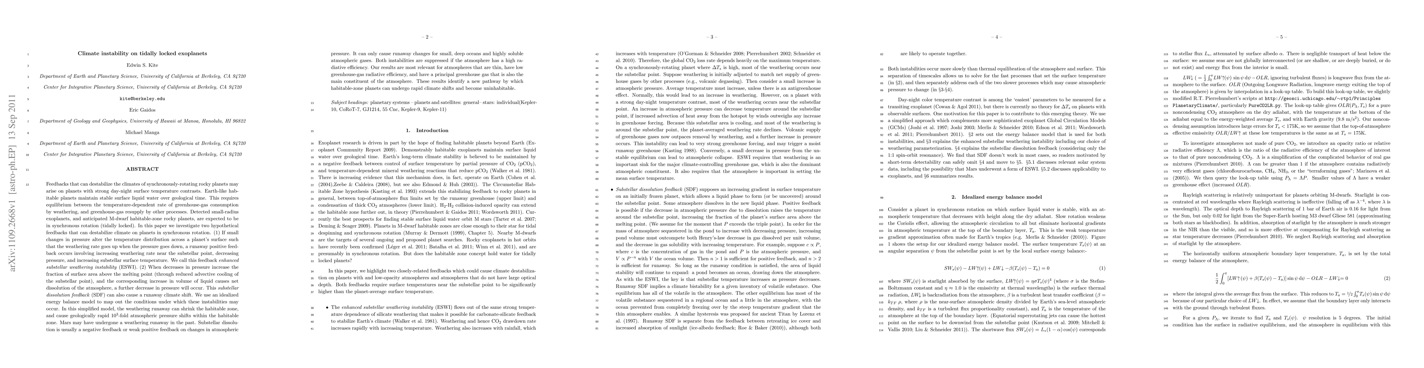 This paper explores climate instability mechanisms on tidally locked exoplanets, identifying two destabilizing feedbacks: a weathering runaway and substellar dissolution. These processes can rapidly shift climates and shrink the habitable zone, especially in planets with thin atmospheres and low greenhouse-gas radiative efficiency.