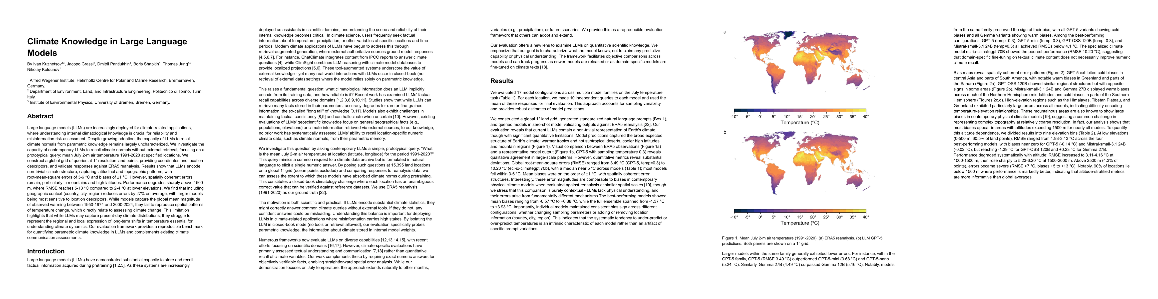 The study evaluated large language models (LLMs) by querying a global grid of 1° resolution land points with coordinates and geographic context, comparing LLM predictions against ERA5 reanalysis data for July mean 2-m air temperatures (1991-2020).
