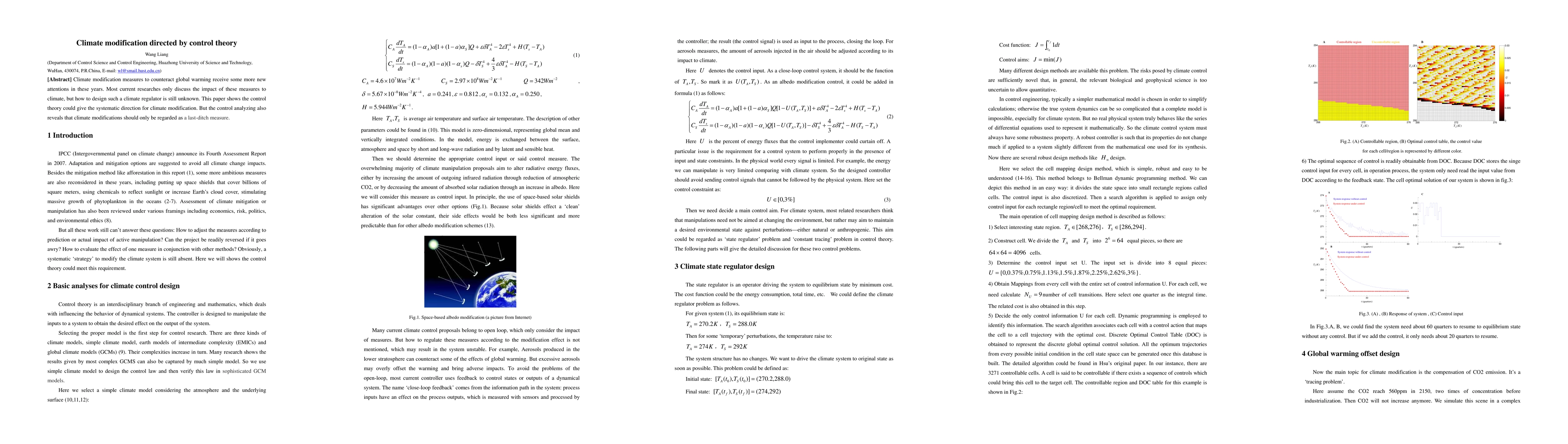 This paper explores the application of control theory to design climate modification systems, suggesting it provides a systematic approach. However, the analysis indicates that such modifications should only be considered as a final resort due to inherent complexities.