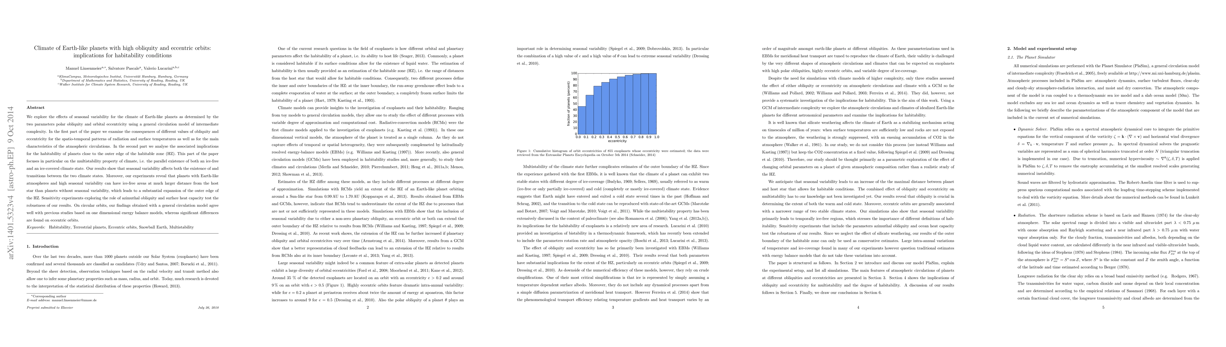 This paper investigates the climate of Earth-like planets with varying obliquity and orbital eccentricity using a general circulation model, finding that high seasonal variability can expand the habitable zone's outer edge by allowing ice-free areas at greater distances from the star. The results also highlight differences in climate stability and habitability compared to circular orbits.