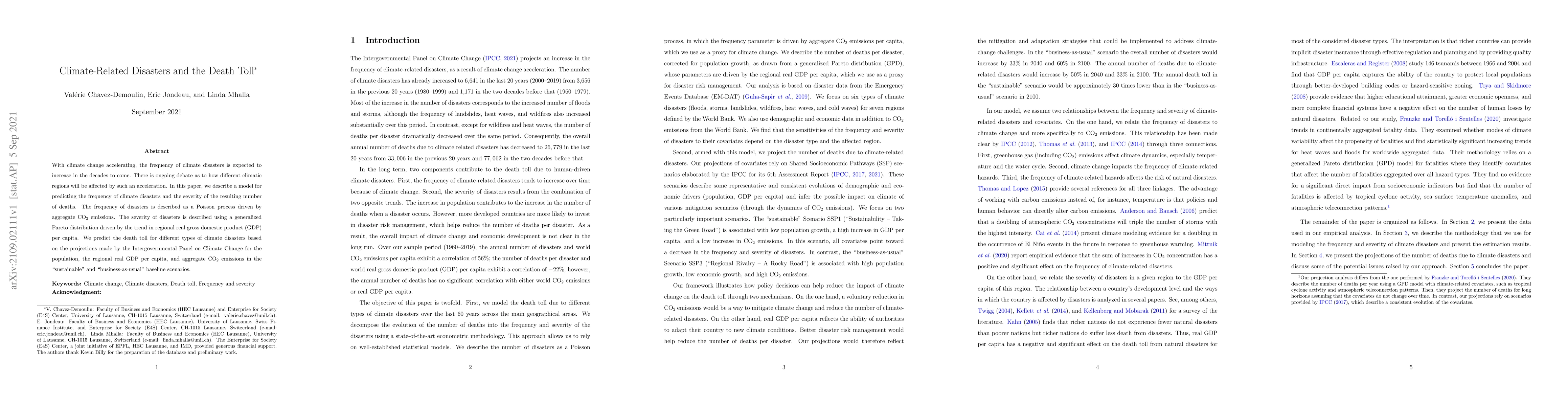 This paper models climate disaster frequency and death toll based on CO2 emissions and regional GDP per capita, projecting increased disasters under both sustainable and business-as-usual scenarios.