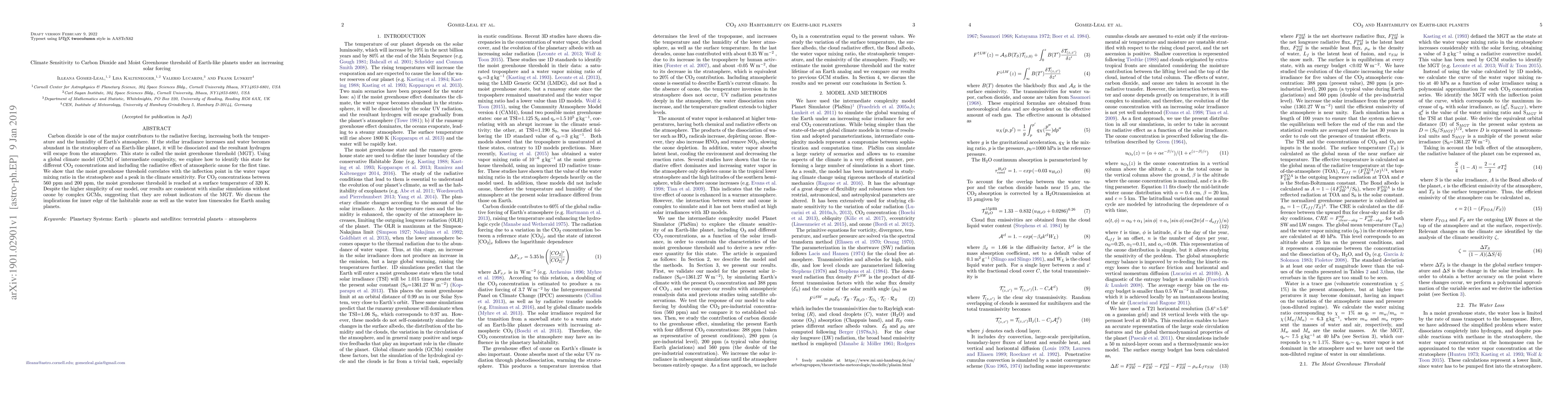 This study uses a global climate model to investigate the moist greenhouse threshold (MGT) of Earth-like planets under increasing solar forcing, finding that MGT correlates with a peak in climate sensitivity. The MGT is reached at 320 K for CO2 concentrations between 560 ppm and 200 ppm, with implications for the habitable zone and water loss on Earth analogs.