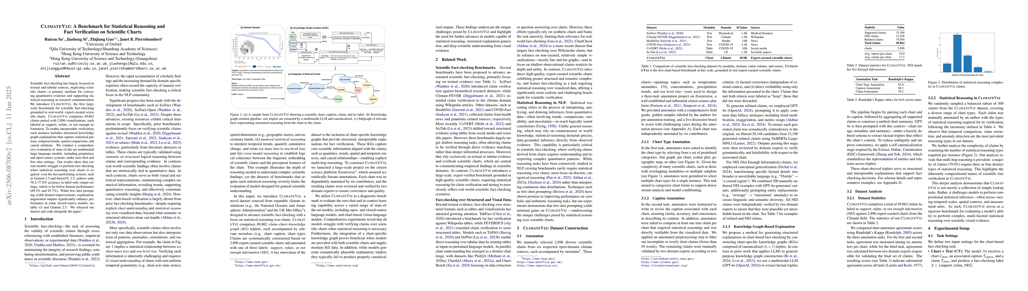 Scientific fact-checking has mostly focused on text and tables, overlooking scientific charts, which are key for presenting quantitative evidence and statistical reasoning. We introduce ClimateViz, the first large-scale benchmark for scientific fact-checking using expert-curated scientific charts. ClimateViz contains 49,862 claims linked to 2,896 visualizations, each labeled as support, refute, or not enough information. To improve interpretability, each example includes structured knowledge graph explanations covering trends, comparisons, and causal relations. We evaluate state-of-the-art multimodal language models, including both proprietary and open-source systems, in zero-shot and few-shot settings. Results show that current models struggle with chart-based reasoning: even the best systems, such as Gemini 2.5 and InternVL 2.5, reach only 76.2 to 77.8 percent accuracy in label-only settings, far below human performance (89.3 and 92.7 percent). Explanation-augmented outputs improve performance in some models. We released our dataset and code alongside the paper.