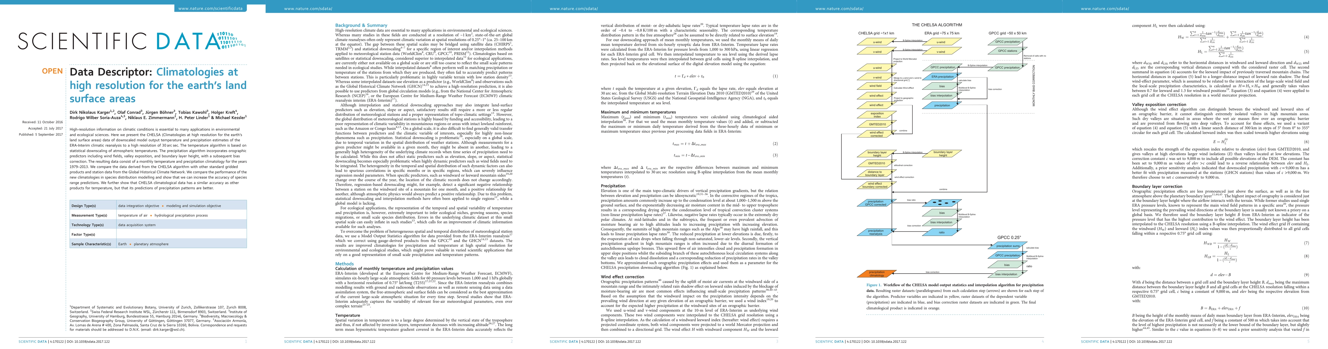 This paper presents high-resolution climatologies for Earth's land surface areas derived from the CHELSA algorithm, which statistically downscales ERA Interim reanalysis data. The climatologies show improved accuracy in species distribution modeling and better precipitation pattern predictions compared to other gridded products.