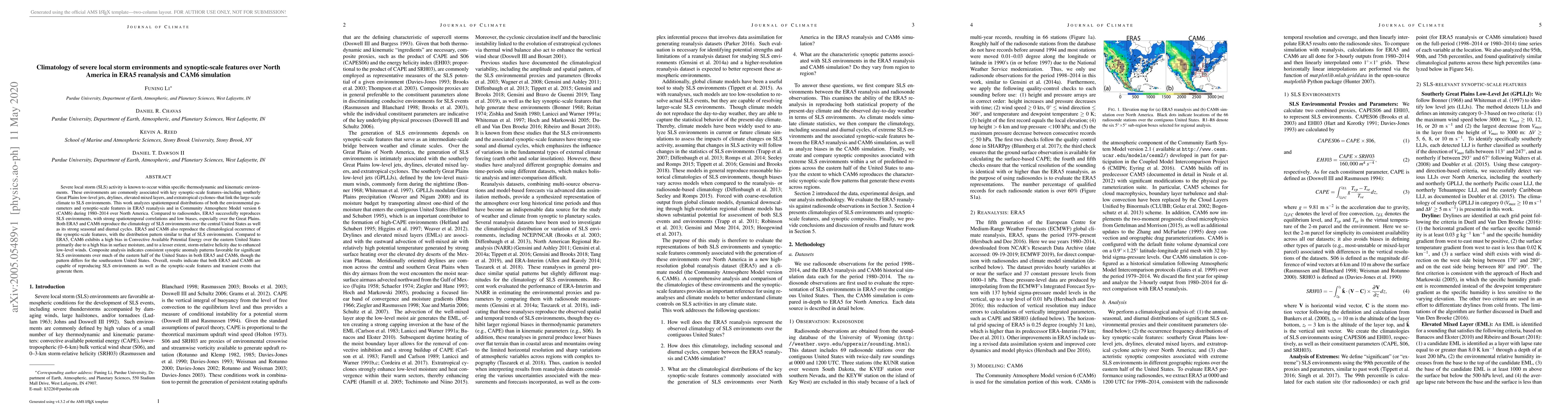 This study evaluates the climatology of severe local storm environments and associated synoptic-scale features in ERA5 reanalysis and CAM6 simulation over North America from 1980 to 2014. Both ERA5 and CAM6 successfully reproduce the spatiotemporal distributions of SLS environments and synoptic features, though CAM6 shows higher biases in moisture and wind-related parameters over the eastern United States.
