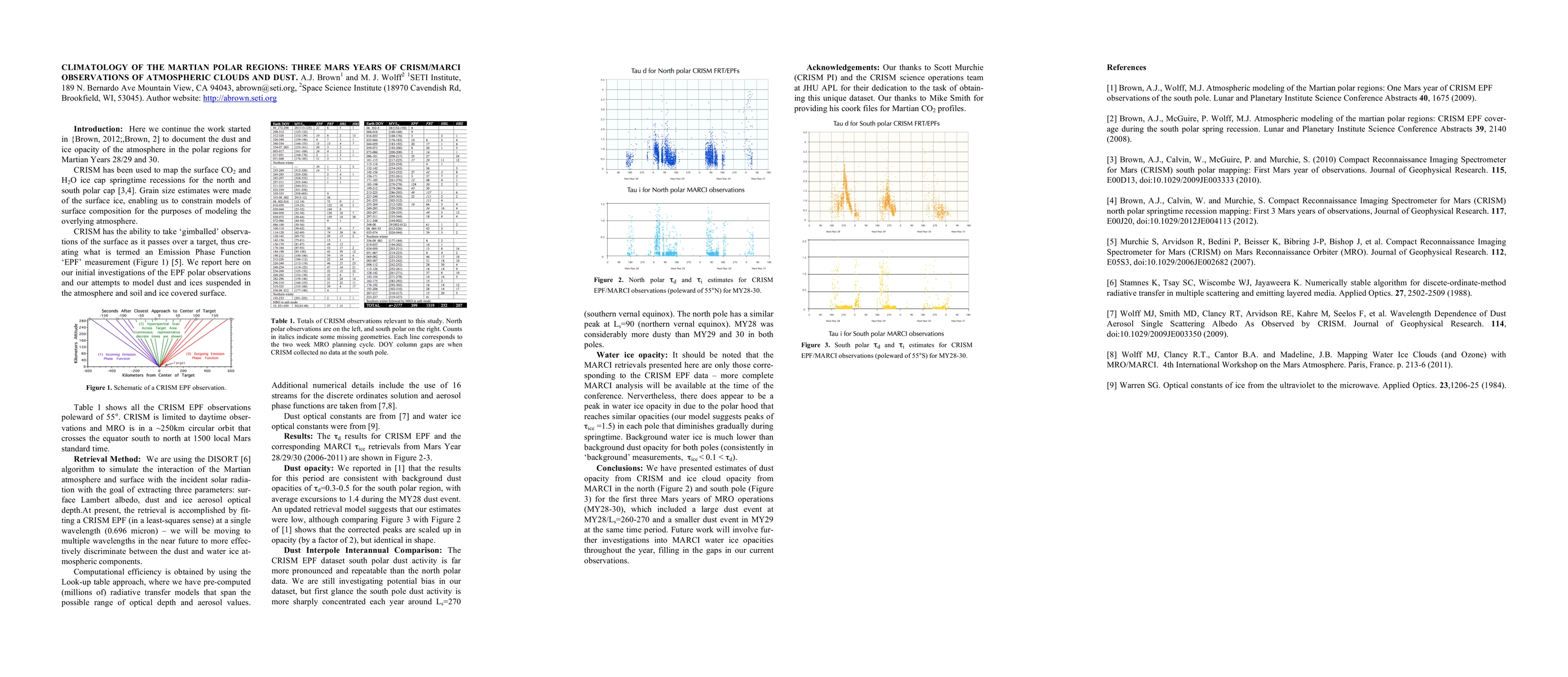 Summary: This study synthesizes CRISM and MARCI data to analyze the evolution of atmospheric water ice and dust opacity in Martian polar regions over three Mars years (MY 28-30), providing insights into seasonal and interannual variability.