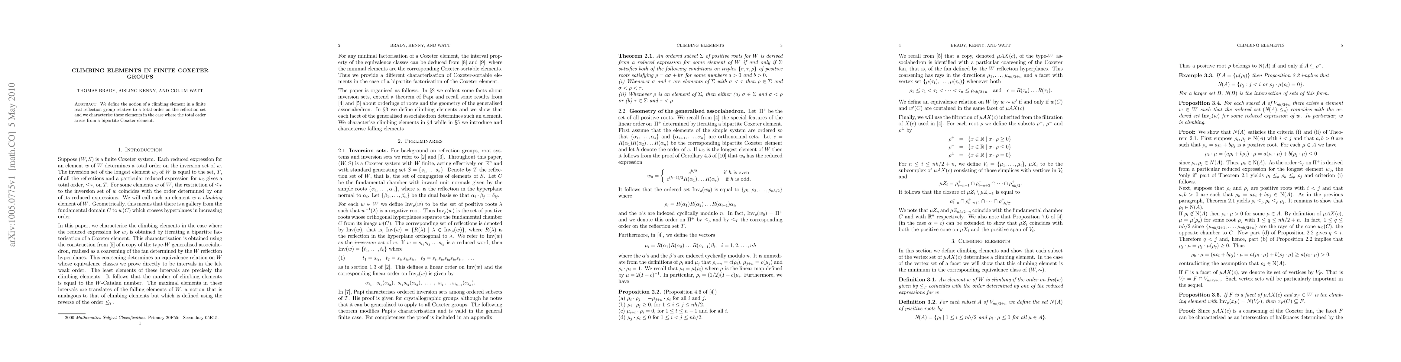 We define the notion of a climbing element in a finite real reflection group relative to a total order on the reflection set and we characterise these elements in the case where the total order arises from a bipartite Coxeter element.