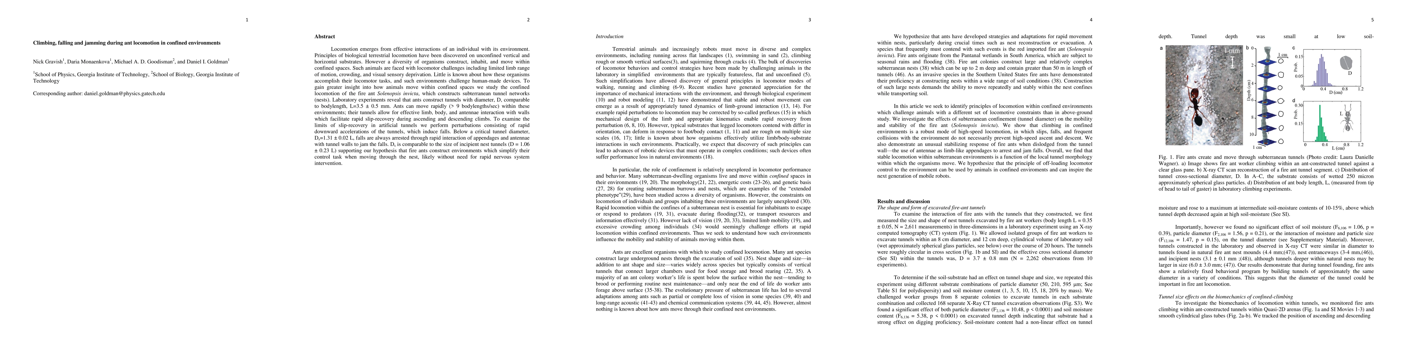 Locomotion emerges from effective interactions of an individual with its environment. Principles of biological terrestrial locomotion have been discovered on unconfined vertical and horizontal substrates. However a diversity of organisms construct, inhabit, and move within confined spaces. Such animals are faced with locomotor challenges including limited limb range of motion, crowding, and visual sensory deprivation. Little is known about how these organisms accomplish their locomotor tasks, and such environments challenge human-made devices. To gain greater insight into how animals move within confined spaces we study the confined locomotion of the fire ant {\em Solenopsis invicta}, which constructs subterranean tunnel networks (nests). Laboratory experiments reveal that ants construct tunnels with diameter, D, comparable to bodylength, L=3.5 $\pm$ 0.5 mm. Ants can move rapidly (> 9 bodylengths/sec) within these environments; their tunnels allow for effective limb, body, and antennae interaction with walls which facilitate rapid slip-recovery during ascending and descending climbs. To examine the limits of slip-recovery in artificial tunnels we perform perturbations consisting of rapid downward accelerations of the tunnels, which induce falls. Below a critical tunnel diameter, $D_s = 1.31 \pm 0.02$ L, falls are always arrested through rapid interaction of appendages and antennae with tunnel walls to jam the falls. $D_s$ is comparable to the size of incipient nest tunnels (D = 1.06 $\pm$ 0.23 L) supporting our hypothesis that fire ants construct environments which simplify their control task when moving through the nest, likely without need for rapid nervous system intervention.