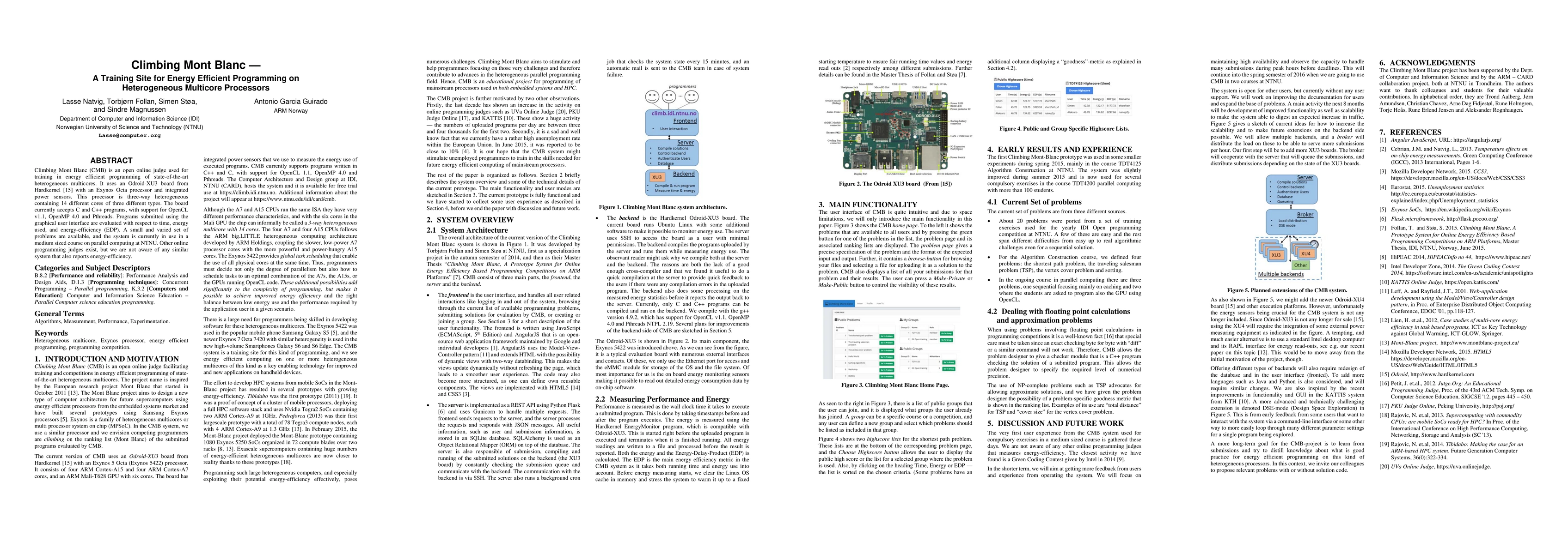 Climbing Mont Blanc (CMB) is an open online judge used for training in energy efficient programming of state-of-the-art heterogeneous multicores. It uses an Odroid-XU3 board from Hardkernel with an Exynos Octa processor and integrated power sensors. This processor is three-way heterogeneous containing 14 different cores of three different types. The board currently accepts C and C++ programs, with support for OpenCL v1.1, OpenMP 4.0 and Pthreads. Programs submitted using the graphical user interface are evaluated with respect to time, energy used, and energy-efficiency (EDP). A small and varied set of problems are available, and the system is currently in use in a medium sized course on parallel computing at NTNU. Other online programming judges exist, but we are not aware of any similar system that also reports energy-efficiency.