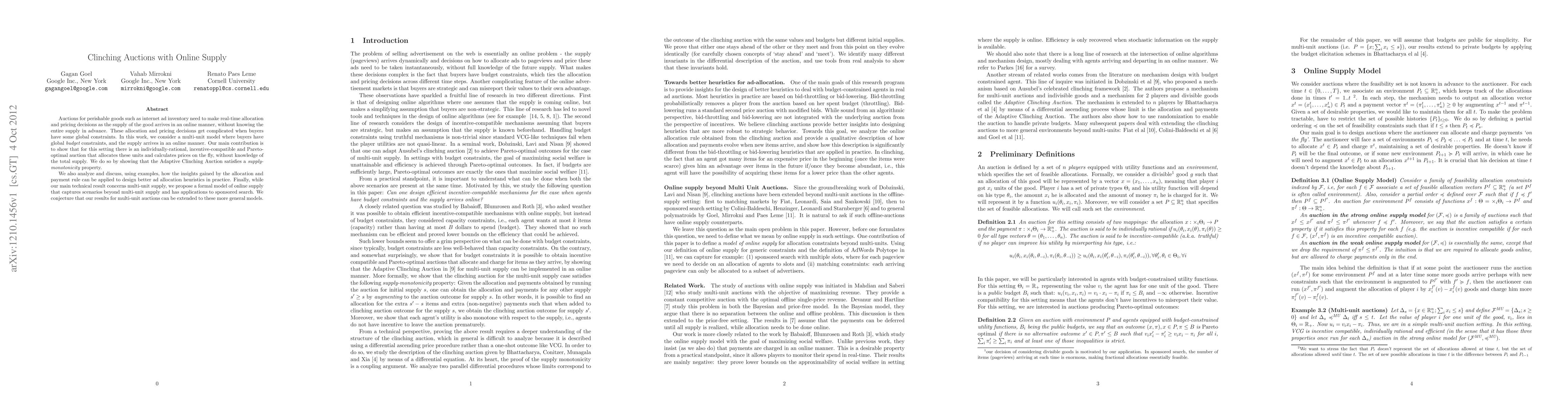 This paper presents an Adaptive Clinching Auction for allocating perishable goods like internet ad inventory in real-time, addressing budget constraints of buyers. The auction achieves individual rationality, incentive compatibility, and Pareto optimality without prior knowledge of total supply, leveraging supply-monotonicity. The authors also discuss practical applications and propose a broader model for online supply scenarios.