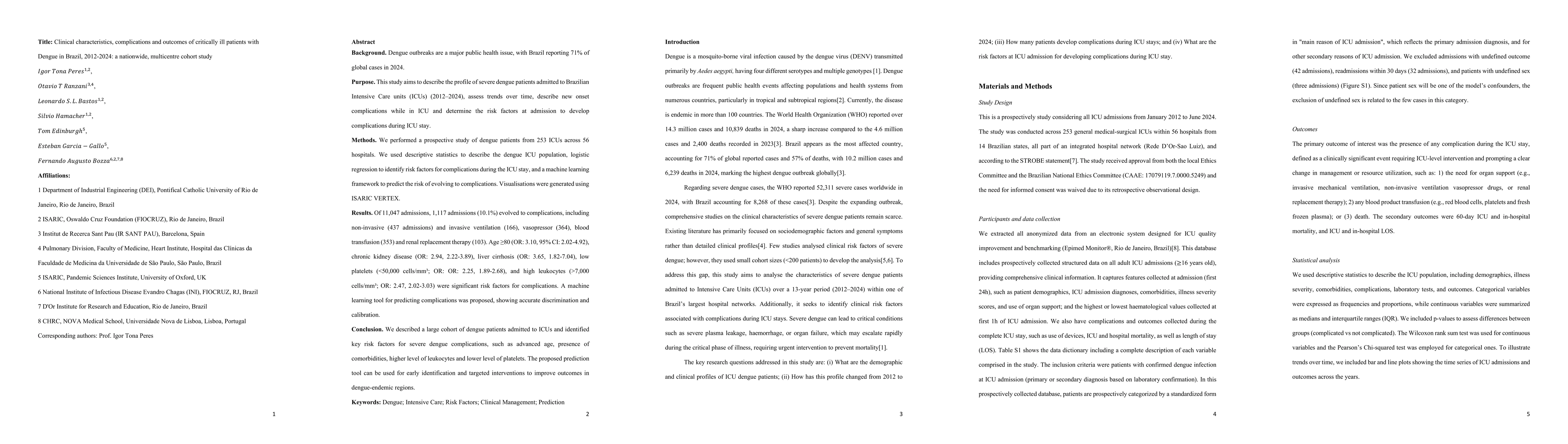 Background. Dengue outbreaks are a major public health issue, with Brazil reporting 71% of global cases in 2024. Purpose. This study aims to describe the profile of severe dengue patients admitted to Brazilian Intensive Care units (ICUs) (2012-2024), assess trends over time, describe new onset complications while in ICU and determine the risk factors at admission to develop complications during ICU stay. Methods. We performed a prospective study of dengue patients from 253 ICUs across 56 hospitals. We used descriptive statistics to describe the dengue ICU population, logistic regression to identify risk factors for complications during the ICU stay, and a machine learning framework to predict the risk of evolving to complications. Visualisations were generated using ISARIC VERTEX. Results. Of 11,047 admissions, 1,117 admissions (10.1%) evolved to complications, including non-invasive (437 admissions) and invasive ventilation (166), vasopressor (364), blood transfusion (353) and renal replacement therapy (103). Age>80 (OR: 3.10, 95% CI: 2.02-4.92), chronic kidney disease (OR: 2.94, 2.22-3.89), liver cirrhosis (OR: 3.65, 1.82-7.04), low platelets (<50,000 cells/mm3; OR: OR: 2.25, 1.89-2.68), and high leukocytes (>7,000 cells/mm3; OR: 2.47, 2.02-3.03) were significant risk factors for complications. A machine learning tool for predicting complications was proposed, showing accurate discrimination and calibration. Conclusion. We described a large cohort of dengue patients admitted to ICUs and identified key risk factors for severe dengue complications, such as advanced age, presence of comorbidities, higher level of leukocytes and lower level of platelets. The proposed prediction tool can be used for early identification and targeted interventions to improve outcomes in dengue-endemic regions.