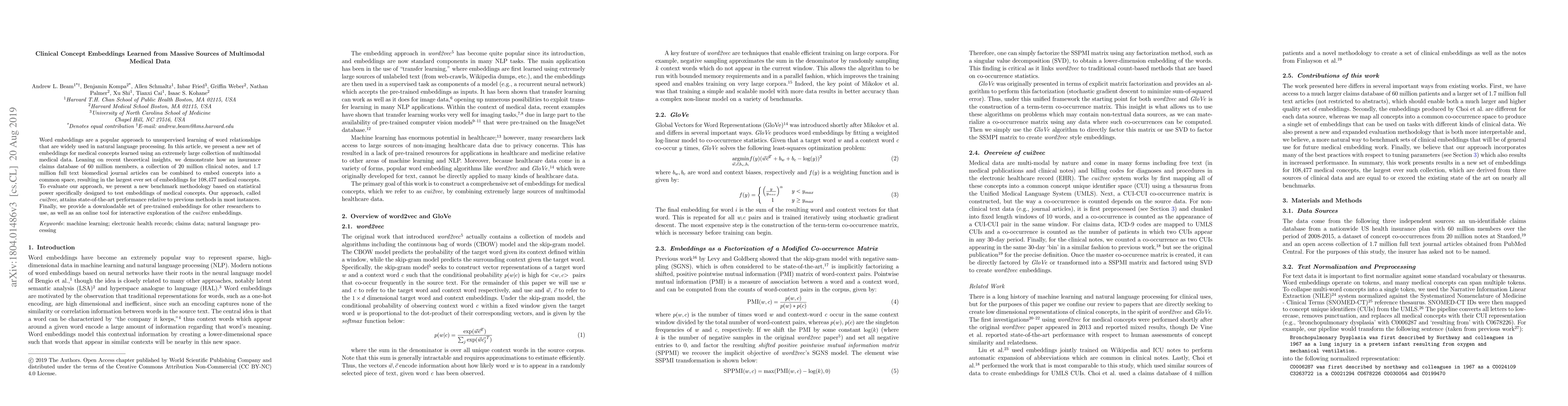 This paper introduces cui2vec, a novel method for embedding medical concepts using a vast multimodal dataset, achieving state-of-the-art performance. It combines data from insurance claims, clinical notes, and biomedical articles to create a comprehensive set of 108,477 medical concept embeddings.