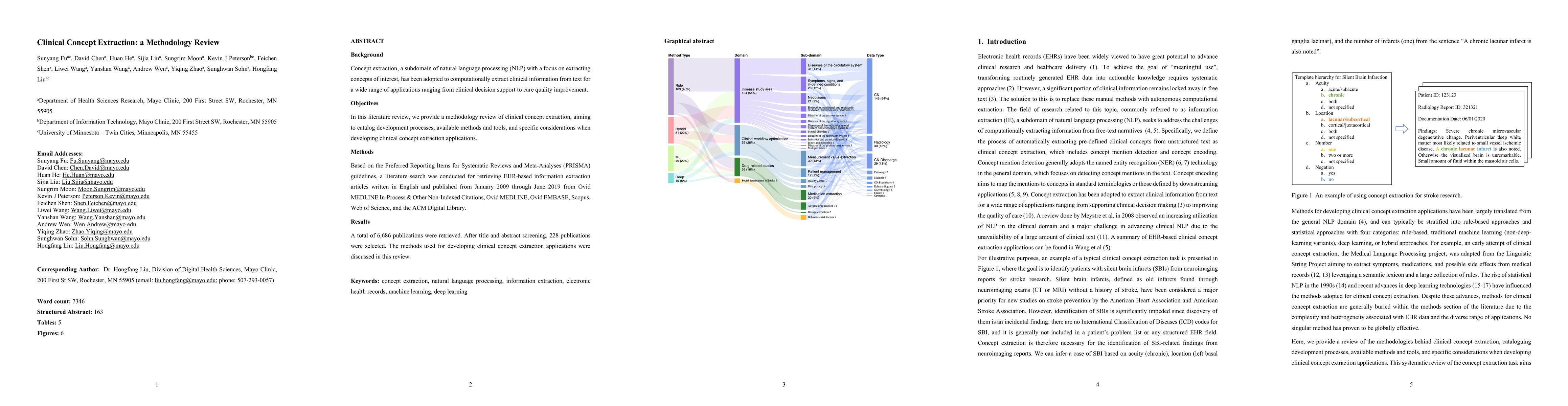 Background Concept extraction, a subdomain of natural language processing (NLP) with a focus on extracting concepts of interest, has been adopted to computationally extract clinical information from text for a wide range of applications ranging from clinical decision support to care quality improvement. Objectives In this literature review, we provide a methodology review of clinical concept extraction, aiming to catalog development processes, available methods and tools, and specific considerations when developing clinical concept extraction applications. Methods Based on the Preferred Reporting Items for Systematic Reviews and Meta-Analyses (PRISMA) guidelines, a literature search was conducted for retrieving EHR-based information extraction articles written in English and published from January 2009 through June 2019 from Ovid MEDLINE In-Process & Other Non-Indexed Citations, Ovid MEDLINE, Ovid EMBASE, Scopus, Web of Science, and the ACM Digital Library. Results A total of 6,686 publications were retrieved. After title and abstract screening, 228 publications were selected. The methods used for developing clinical concept extraction applications were discussed in this review.