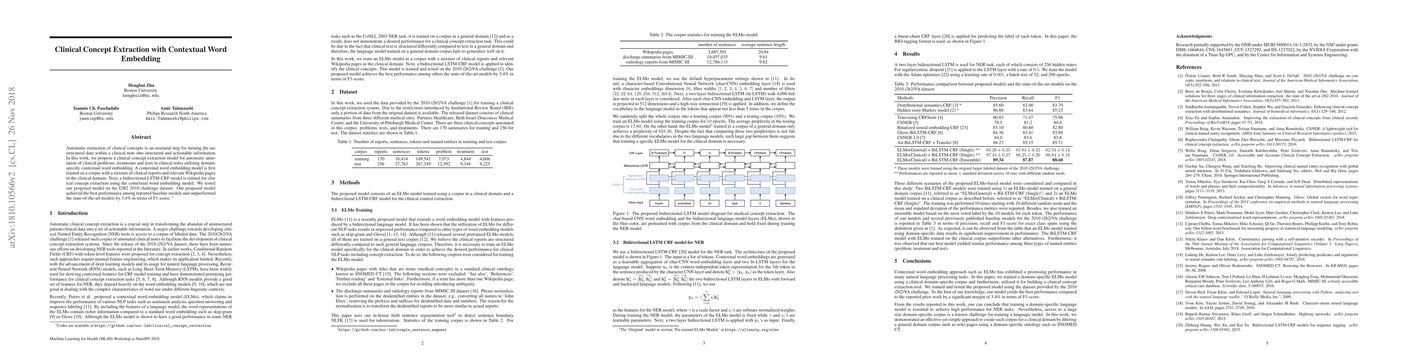 This research proposes a model for extracting clinical concepts from unstructured clinical notes using contextual word embeddings, achieving superior performance on the I2B2 2010 dataset compared to baseline and state-of-the-art models by 3.4% in F1-score. The model leverages a bidirectional LSTM-CRF trained on embeddings derived from a clinical corpus and relevant Wikipedia pages.