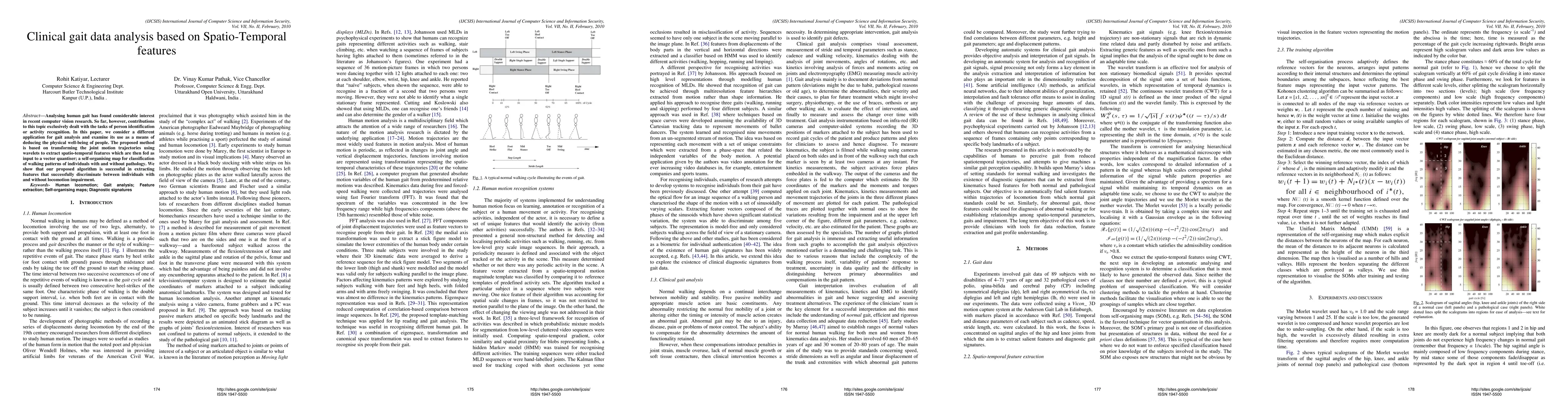 This paper proposes a method for analyzing human gait to deduce physical well-being by extracting spatio-temporal features from joint motion trajectories using wavelets. The features are classified using a self-organizing map, successfully distinguishing between individuals with and without locomotion impairments.